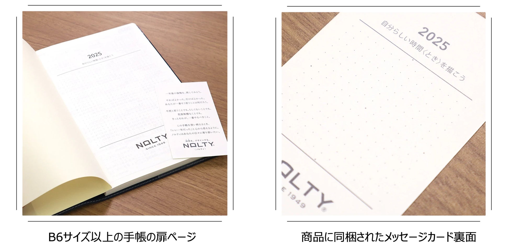 NOLTYは、日々のスケジュールやタスク管理にとどまらず、手帳を使うことで、自分らしい未来に向けて豊かな時間〈とき〉をデザインしてほしいと願っています。そこで、手帳のいちばん最初の扉ページに、自分らしい時間〈とき〉をデザインするためのフォーマットを2025年版の手帳から設けました(※B6サイズ以上の手帳を中心に、一部商品を除く。順次拡大予定)。