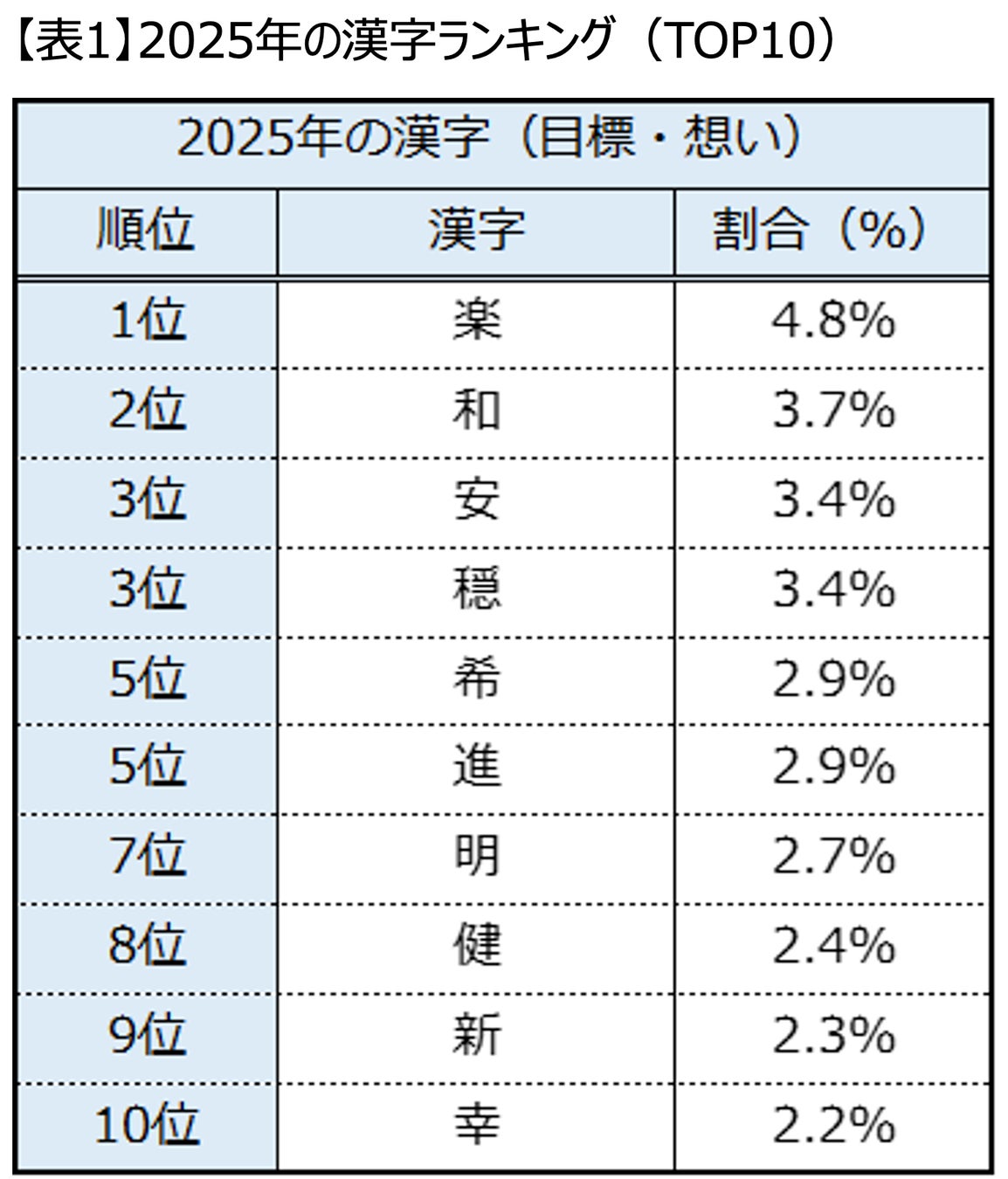 『2025年への目標や想いを表す漢字』は、1位は「楽」(応募総数における割合:4.8%)、2位は「和」(3.7%)、3位は同率で「安」「穏」(3.4%)という結果になりました。【表1】