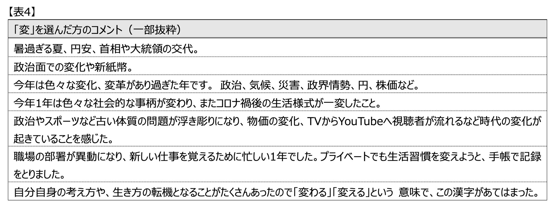 2024年を表す漢字として1位となった「変」を選ばれた方のコメントをご紹介します。「変」を選ばれた理由として、岸田首相退陣による衆議院選挙、東京都知事選や兵庫県知事選などでSNS旋風が起こった政治、猛暑日が過去最多となった気候や年明け早々に起きた石川県・能登地方の地震などの災害、円安や株価の乱高下など、あらゆる面で変化が多かったことから、「変」を選ばれていることが伺えます。また、個人的な出来事においても変化が多かったと答える方が多数を占めたため、世の中の変化と個人の変化の両方の出来事から、「変」が1位となりました。【表4】