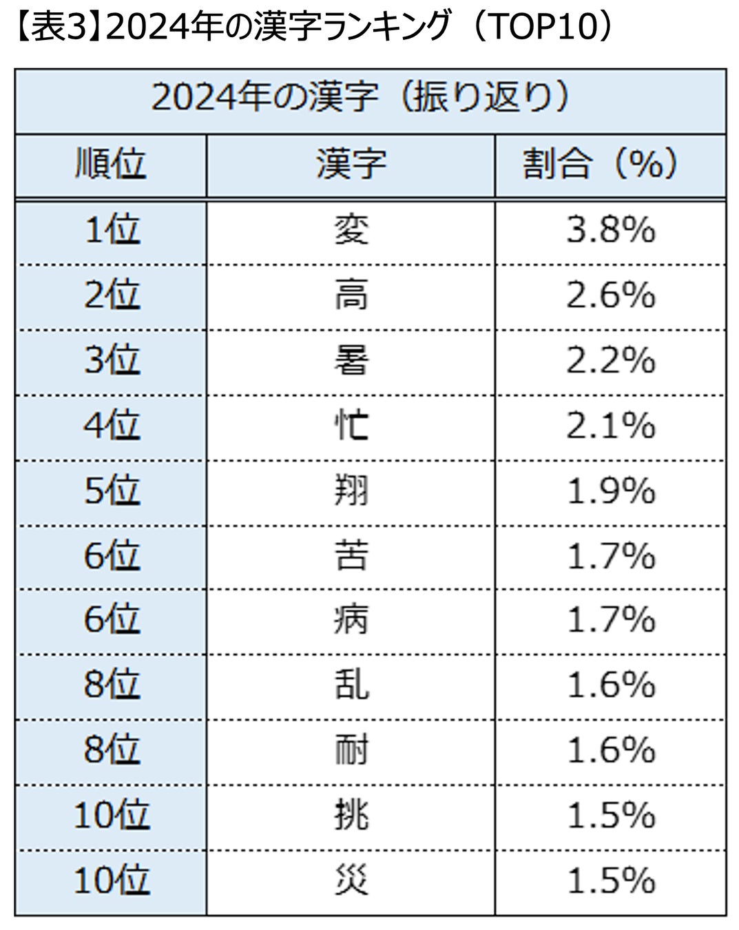 『2024年を表す漢字』は、1位は「変」(応募総数における割合:3.8%)、2位は「高」(2.6%)、3位は「暑」(2.2%)となりました。【表3】