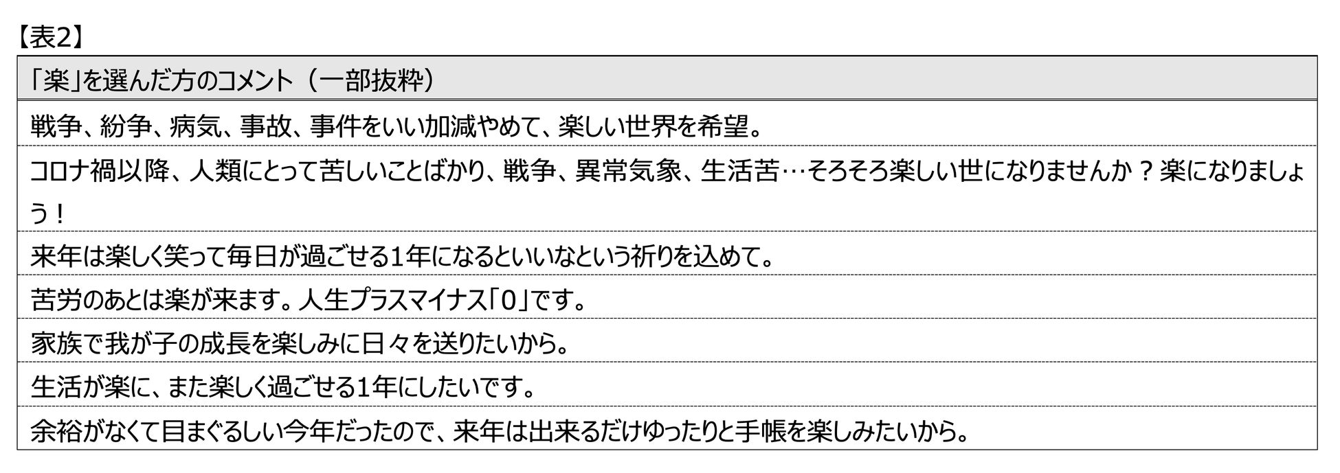 2025年への目標や想いを表す漢字として1位となった「楽」を選ばれた方のコメントをご紹介します。「楽」を選ばれた理由として、戦争や紛争などの世界情勢に対する不安感、物価上昇などからくる生活苦、猛暑日が続いた異常気象など、数年来続く様々な面での苦しいことや辛いニュースを踏まえて、来年こそは楽しい世の中になって欲しい、楽しい日々を送りたいと、未来への期待や希望が読み取れます。【表2】