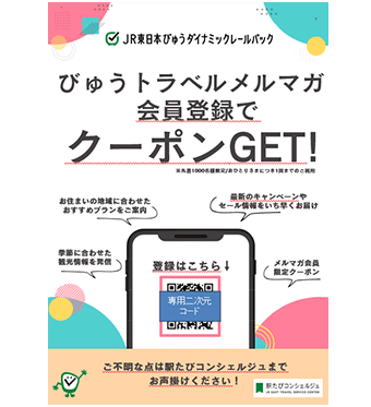 キャンペーン対象の駅たびコンシェルジュでびゅうトラベルメルマガに新規会員登録していただいた方に、JR東日本びゅうダイナミックレールパックの「5%OFFクーポン」と「10周年記念ノベルティ」をプレゼント!ノベルティの配布はなくなり次第終了となります。5%OFFクーポンは先着利用1,000名さまとなりますので、お申込みはお早めに!