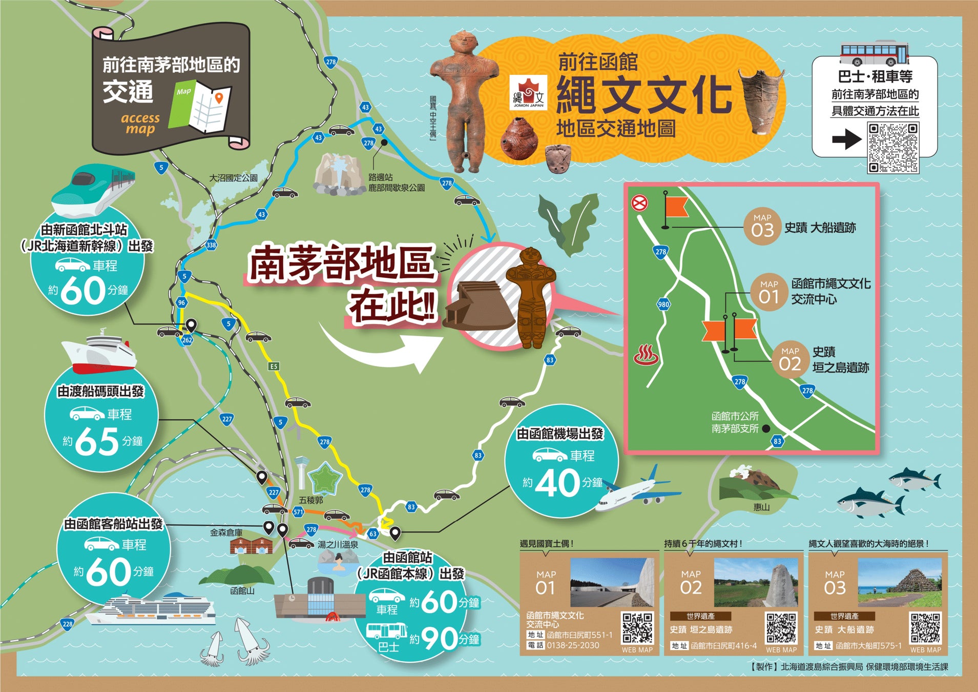 世界遺産「北海道・北東北の縄文遺跡群」の構成資産である垣ノ島遺跡や大船遺跡、国宝「中空土偶」を所蔵する函館市縄文文化交流センターの所在地である南茅部エリアへ、外国人を含む多くの観光客の来訪促進を図るため、函館のゲートウェイであるJR函館駅、新函館北斗駅、函館空港、津軽海峡フェリー、函館クルーズターミナルから南茅部エリアまでのアクセス情報を記した、日英中韓各言語ごとの多言語マップを制作し、各ゲートウェイに当該マップのパネルを設置しました。