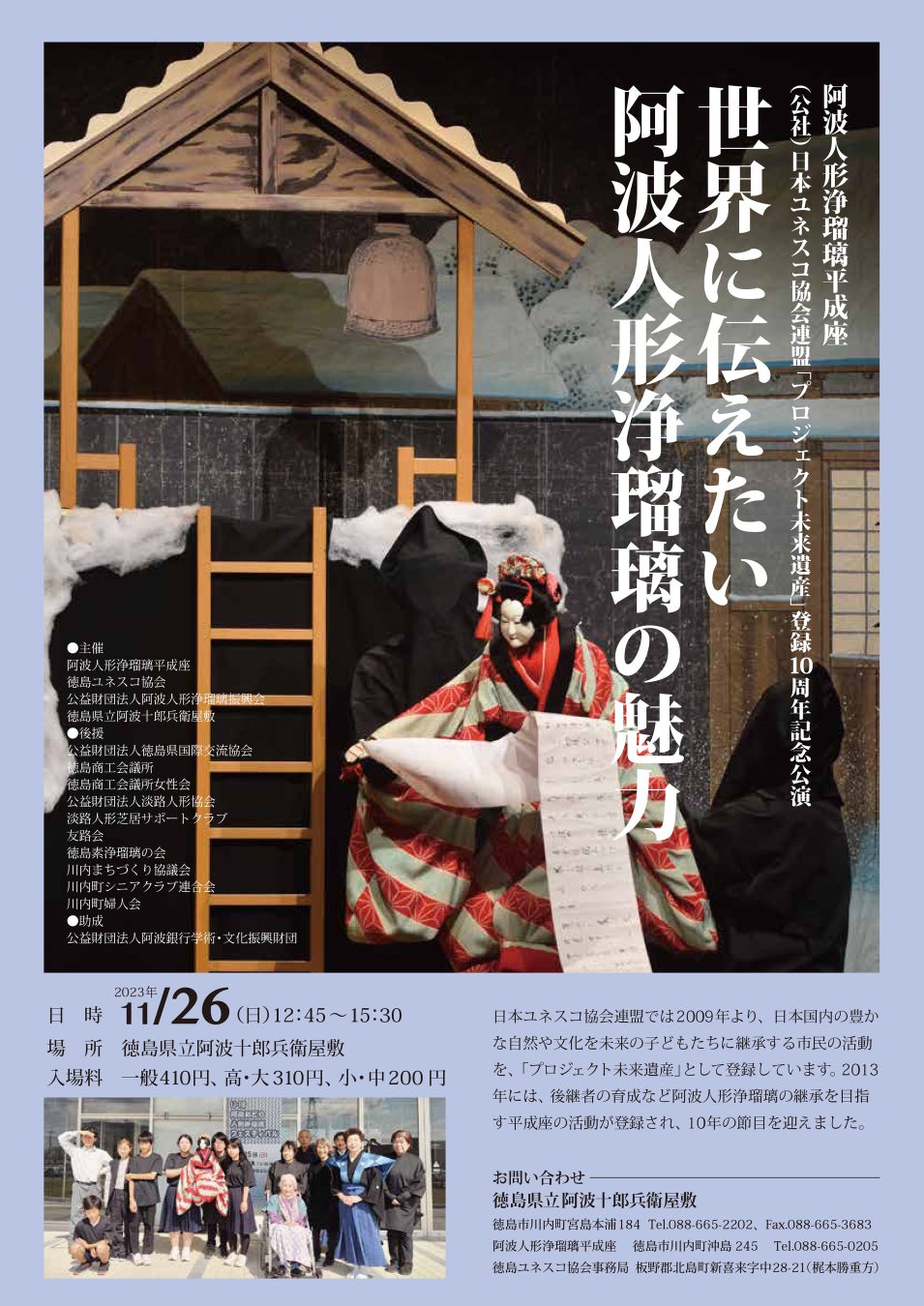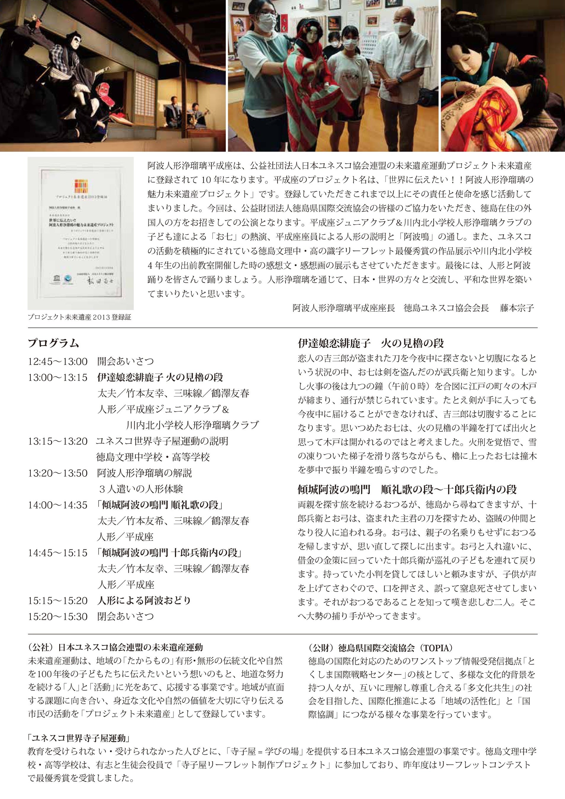 日本ユネスコ協会連盟では2009年より、日本国内の豊かな自然や文化を未来の子どもたちに継承する市民の活動を、「プロジェクト未来遺産」として登録しています。2013年には、後継者の育成など阿波人形浄瑠璃の継承を目指す平成座の活動が登録され、10年の節目を迎えました。後継者の育成とともに活発な公演活動を続けている平成座の公演を、ぜひこの機会にご鑑賞ください。