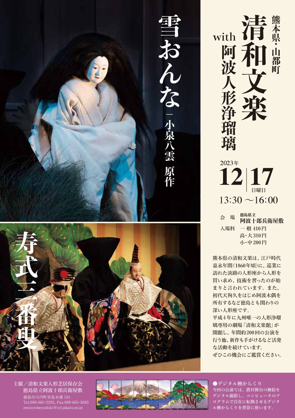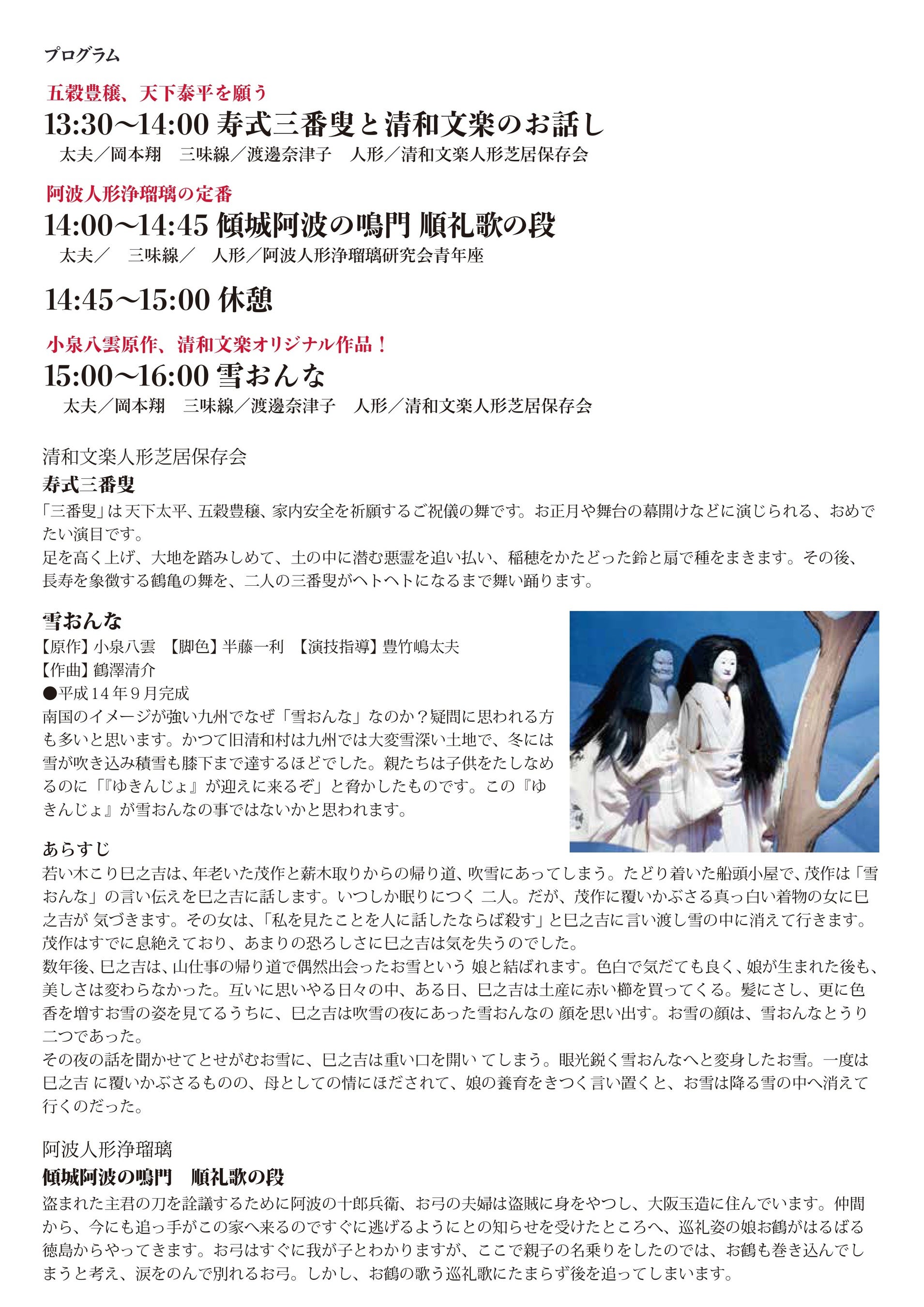 ③15:00〜16:00 小泉八雲原作、清和文楽オリジナル作品「雪おんな」