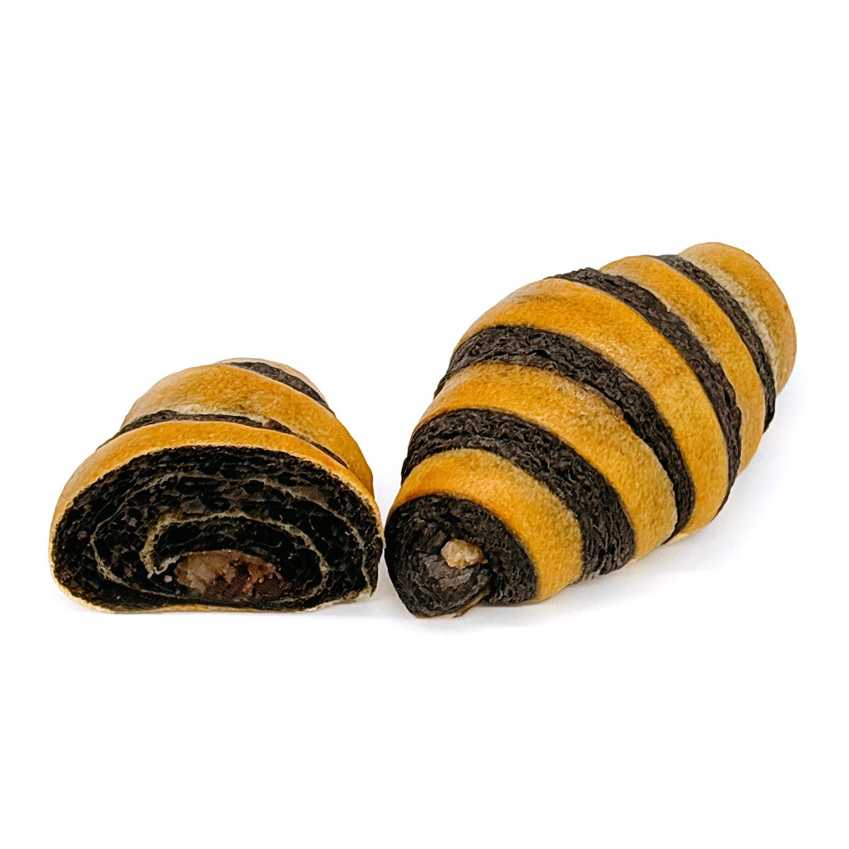 チョコチップ入りのバナナあんを黒と黄色の生地で巻き込みました。チョコバナナのような味わいをお楽しみください。