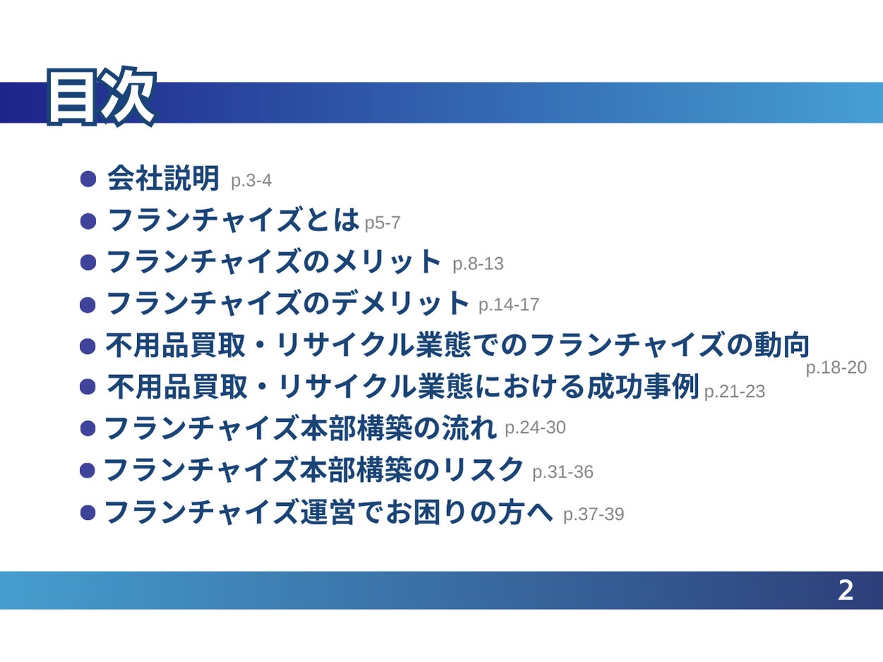 本レポートでは、不用品回収・リサイクル業態の経営者向けにフランチャイズの基本的な仕組み、メリットとデメリット、本部を構築する際の流れやリスクについて解説し、フランチャイズビジネスを始めるために必要な情報や注意点を紹介いたします。