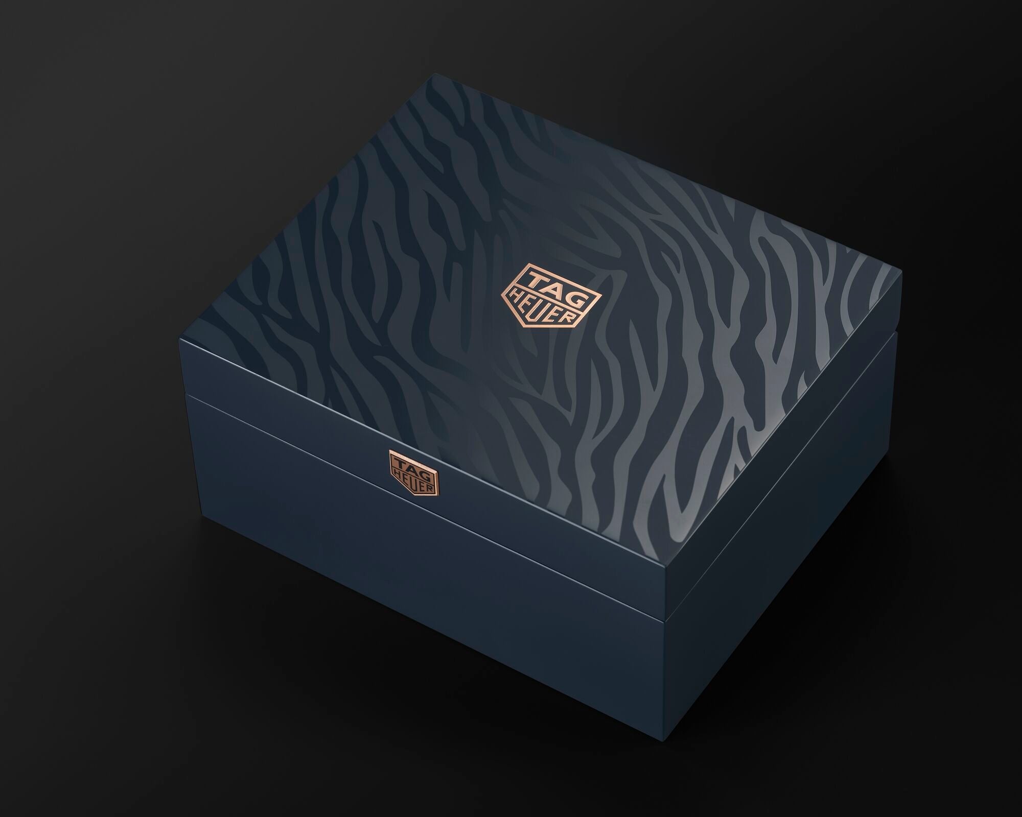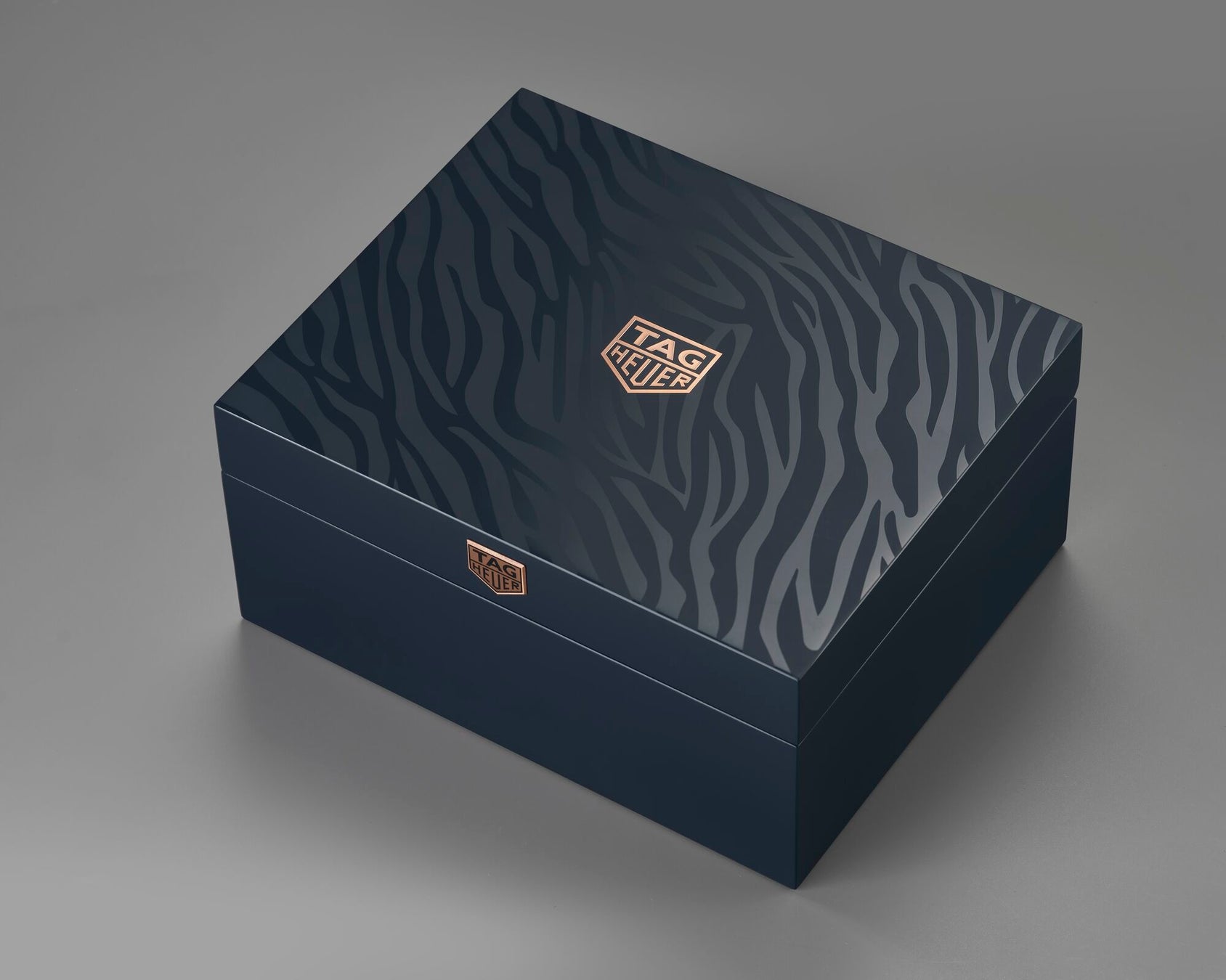 このタイムピースは時計のダイヤルと同じブルーのタイガーストライプを施したラッカーボックスに入れてお届けいたします。