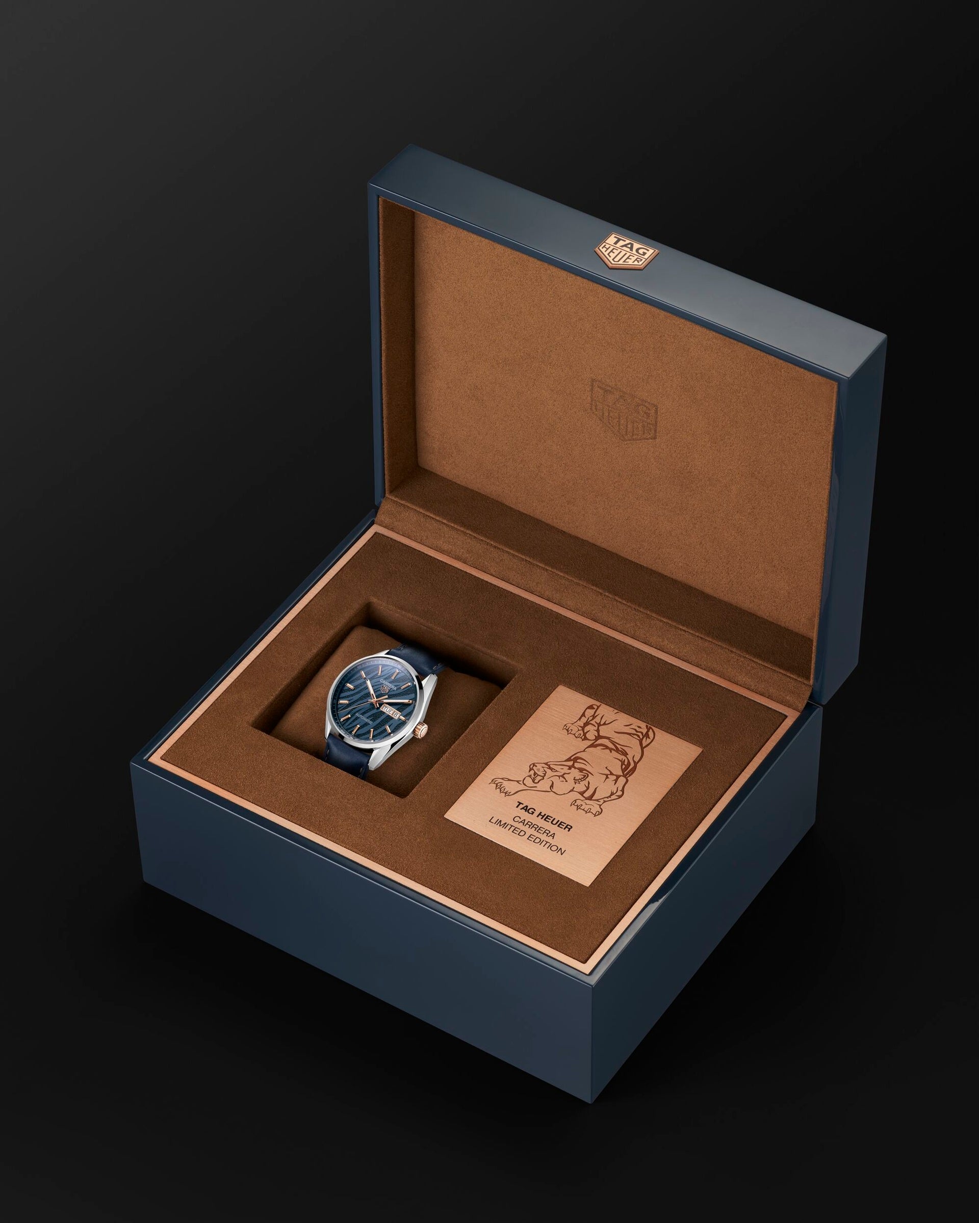 2022年、タグ・ホイヤーは限定モデル、「タグ・ホイヤー カレラ イヤー オブ ザ タイガー リミテッドエディション」を発売します。寅年にふさわしく、スポーティかつ伝統的なデザインをまとった逸品です。端正なダイヤルには、水のような青みを帯びた、控えめな淡いブルーと濃いブルーのストライプが描かれ、さながら虎の毛皮を彷彿とさせます。淡いブルーストライプは、ブルーのPVDコーティングを施したブラッシング仕上げ。一方の濃いブルーストライプは絵の具を塗りこめたような質感のマテリアルが使われています。いまにも獲物に飛びかかろうとする青い虎の装飾をあしらったサファイアクリスタルのケースバック側からは時計のムーブメントを鑑賞することができます。本品は300本限定で発売されるため、ケースバックには「ONE OF 300」と刻まれています。