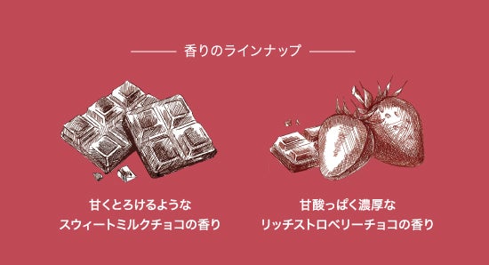 甘くとろけるような「スウィートミルクチョコの香り」、甘酸っぱく濃厚な「リッチストロベリーチョコの香り」の2種がラインナップ。スイーツが好きな方はもちろんのこと、甘いものが苦手な人でも手に取ったり、贈り物としてもほっとひと息つける香りを目指しました。