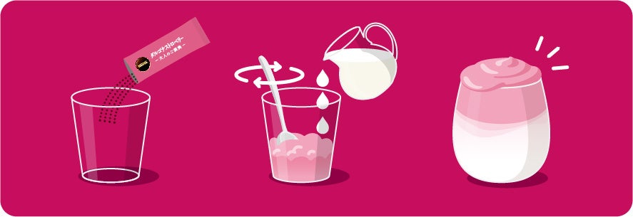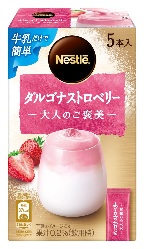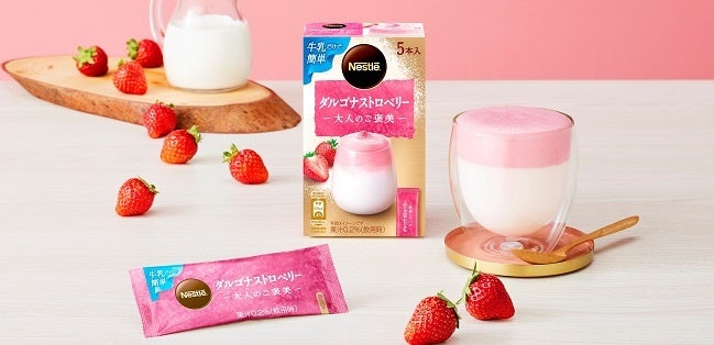 このたび、新たな味わいをお楽しみいただくため、ストロベリーパウダーを使用した新製品「ネスレ 大人のご褒美 ダルゴナストロベリー」を発売します。牛乳の上にふんわりとしたストロベリーの泡がのったかわいい見た目に、一口目に甘酸っぱいストロベリーの香りと味わい、その後に感じられる牛乳の甘み、そしてストロベリーの泡と牛乳が混ざり合った絶妙な味と口当たりの変化を楽しむことができる新感覚のラテメニューです。ストロベリーフレーバーは、カフェやアフタヌーンティーの期間限定メニューとして若い世代を中心に人気があります。きめ細やかでリッチな泡による甘酸っぱいストロベリーの香りと味わいは、牛乳の甘さとの相性もぴったりで、SNSでも映えるような見た目も“かわいい”製品となっています。冷たい牛乳と1本のスティックを混ぜること約 1 分で楽しめる簡便な製品となっています。ネスレは、「ダルゴナストロベリー」を通じて新たなカフェタイムを手軽に満喫していただけるアイテムを提供します。