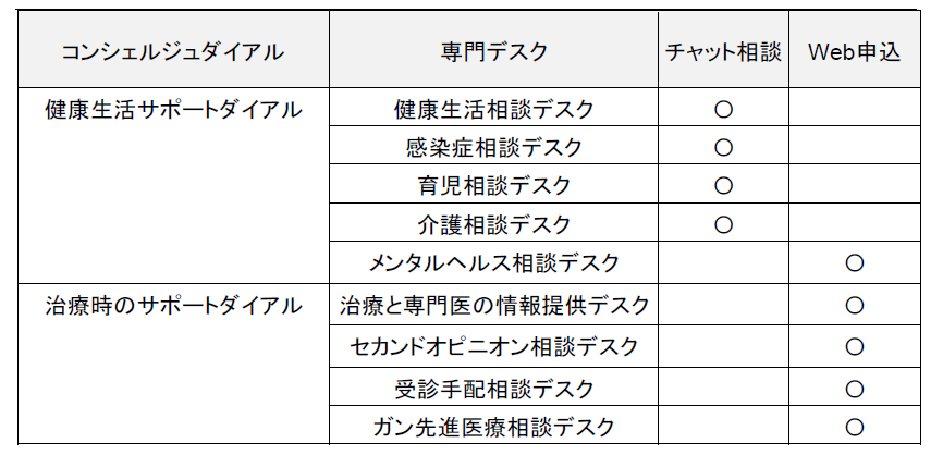 当社の多岐にわたる商品付帯サービスのうち、「健康に関するサービス」※3では、4つのコンシェルジュダイアルでお受けしたご相談について、内容によって20を超える専門デスクできめ細かく対応しております。このたびスタートするオンライン機能は、「健康生活サポートダイアル」と「治療時のサポートダイアル」で受付けている相談内容でご利用いただけます。