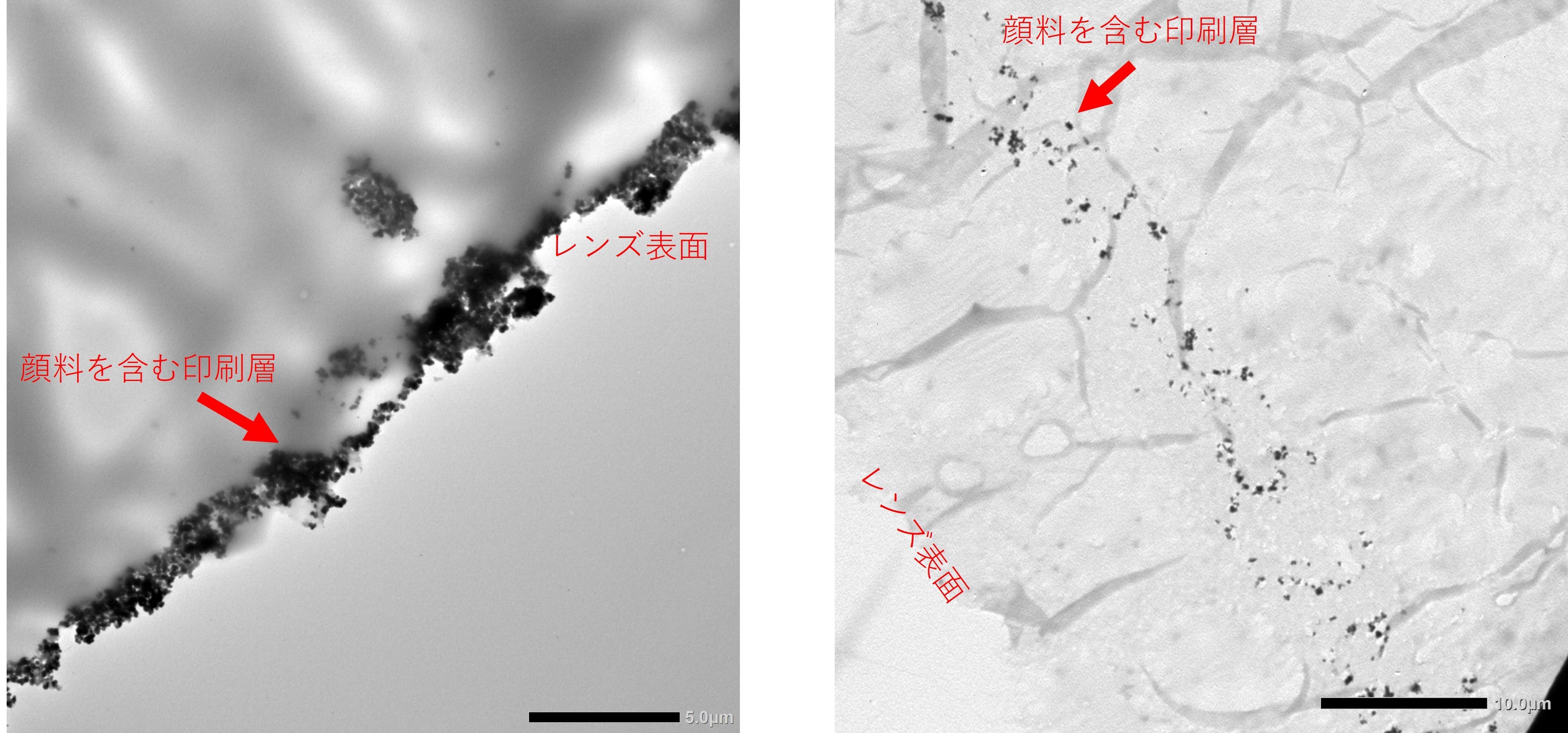 これに対し、メニコンでは、2021年2月に『透過型電子顕微鏡でのサークルレンズのサンドイッチ構造観察法 顕微鏡専門誌「Microscopy」に掲載』※2においてご案内の通り、透過型電子顕微鏡(TEM)を使用した印刷層における顔料の分布構造を観察する手法を開発し、その研究成果は、顕微鏡専門誌へ掲載されました。また、TEMを用いた観察により、市販のカラコン製品の印刷層傾向を調査・分類した結果が、コンタクトレンズ学会誌に掲載されています※3。ただし、このTEMによる観察は、試料作成に高いスキルと、長い測定時間を必要とします。