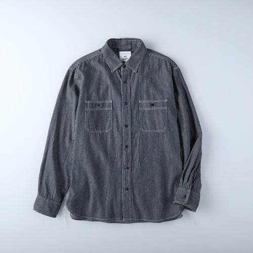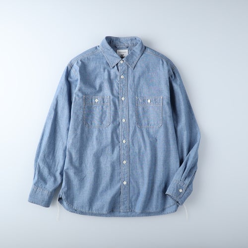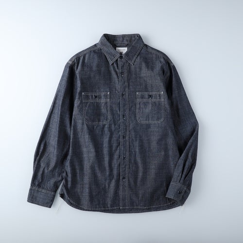 トリプルステッチを使用したオーセンティックなスタイルです。経糸にインディゴ染めの糸、緯糸に無染色の糸で平織という組織で織り上げた生地であるシャンブレーを使用。ムラ感のある糸がヴィンテージ感を引き立たせます。要所には3本針のステッチを配し裾には空環というステッチの延長上の糸を出して当時の仕様を再現しております。