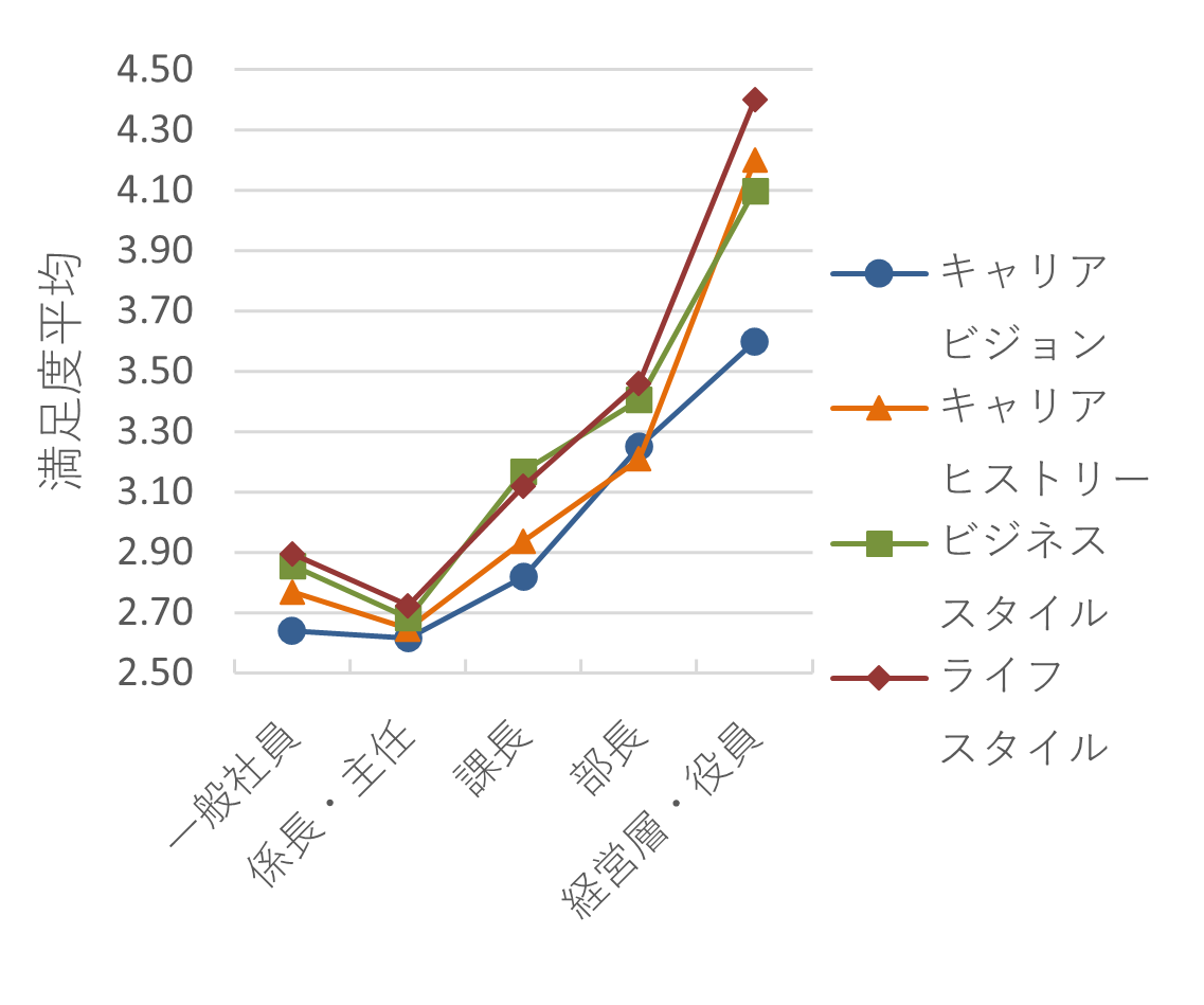 これより、一般社員から係長・主任にかけては、全てのキャリア項目への満足度が低下し、管理職である課長以上に昇格するにつれて、満足度が上昇することが分かった。