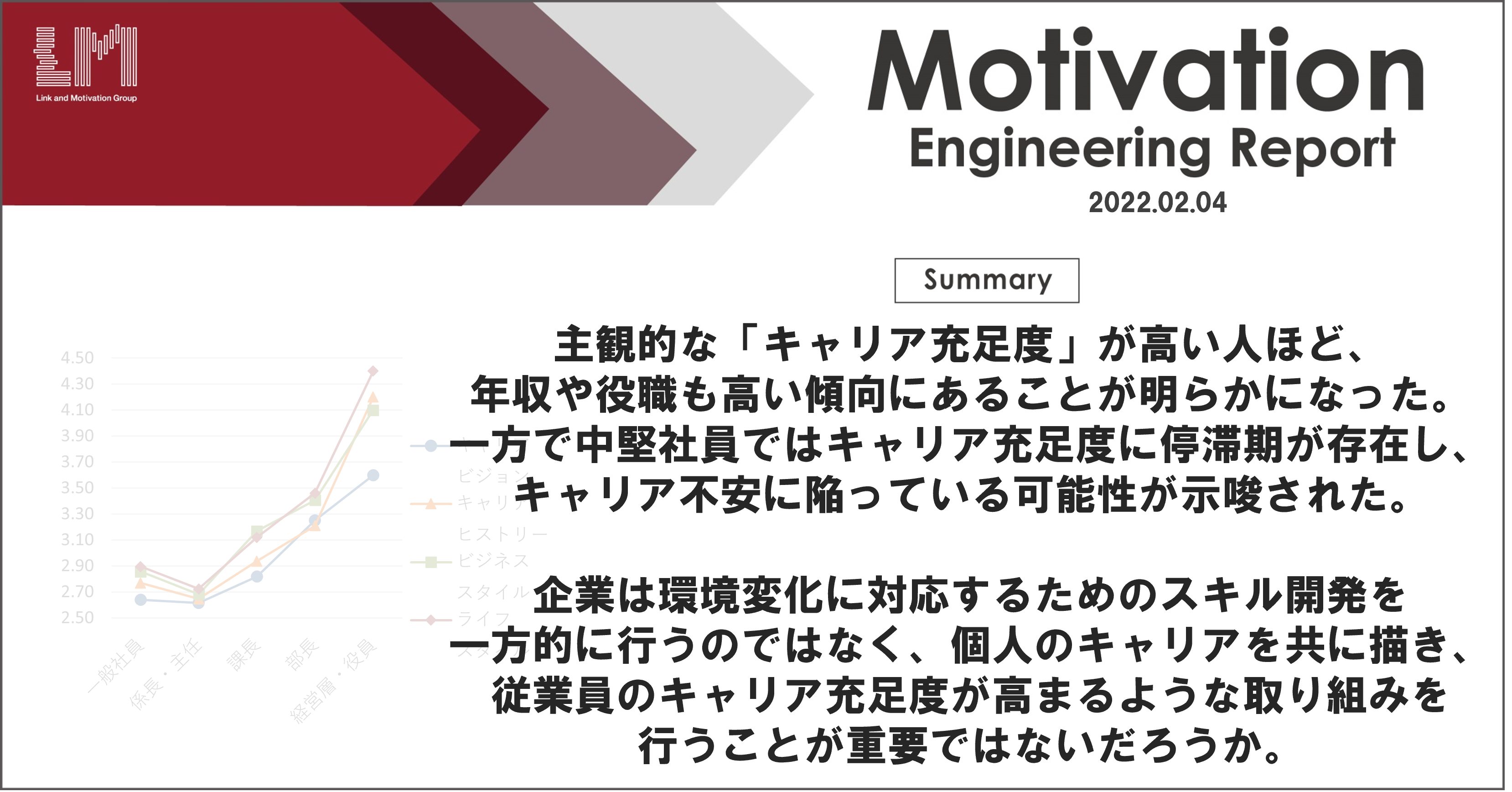 株式会社リンクアンドモチベーション(本社:東京都中央区、代表:小笹芳央、証券コード:2170、以下当社)の研究機関モチベーションエンジニアリング研究所(以下当研究所)は、「主観的な『キャリア充足度』と役職や年収との関係性」に関する調査を行いましたので、結果を報告いたします。