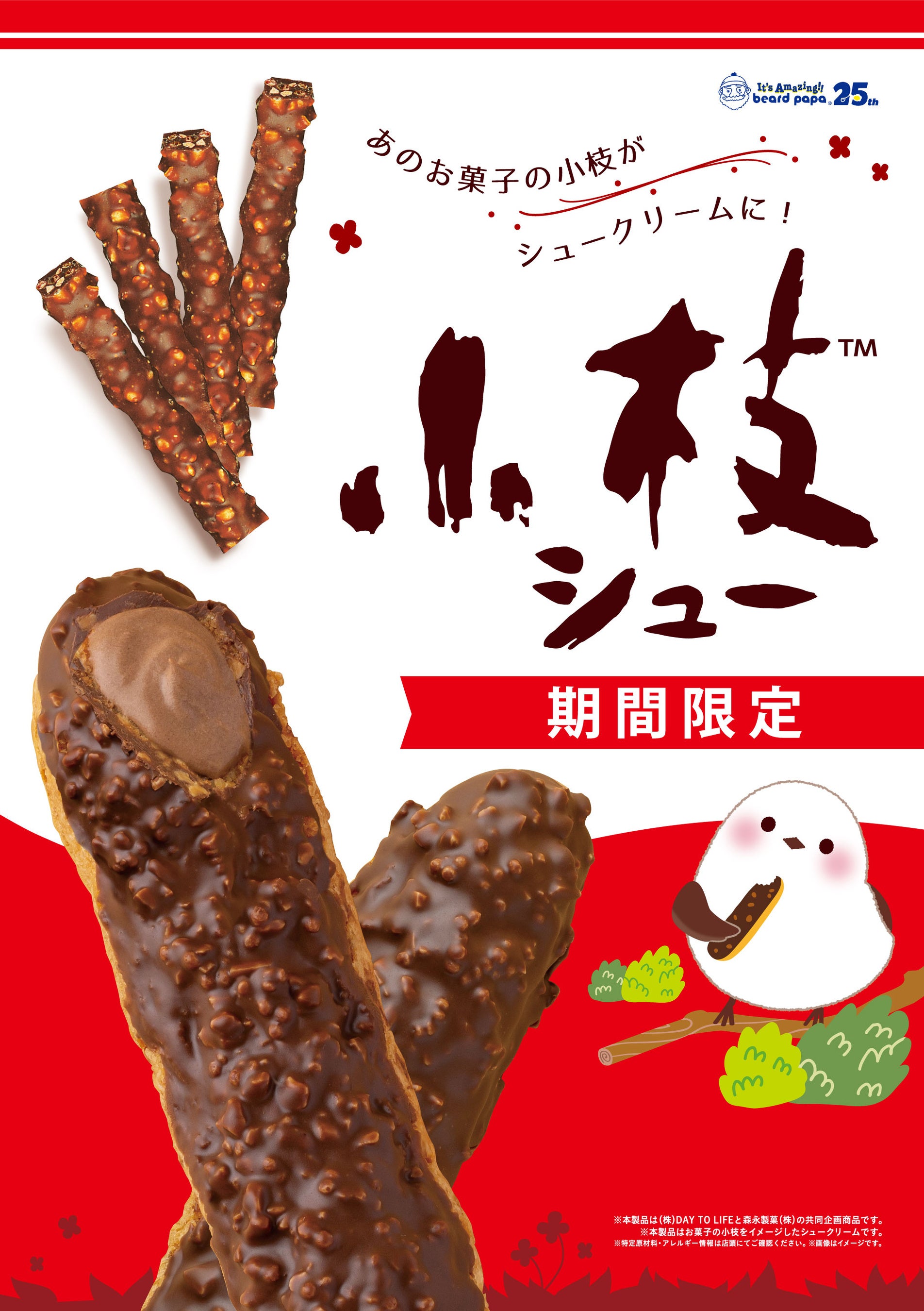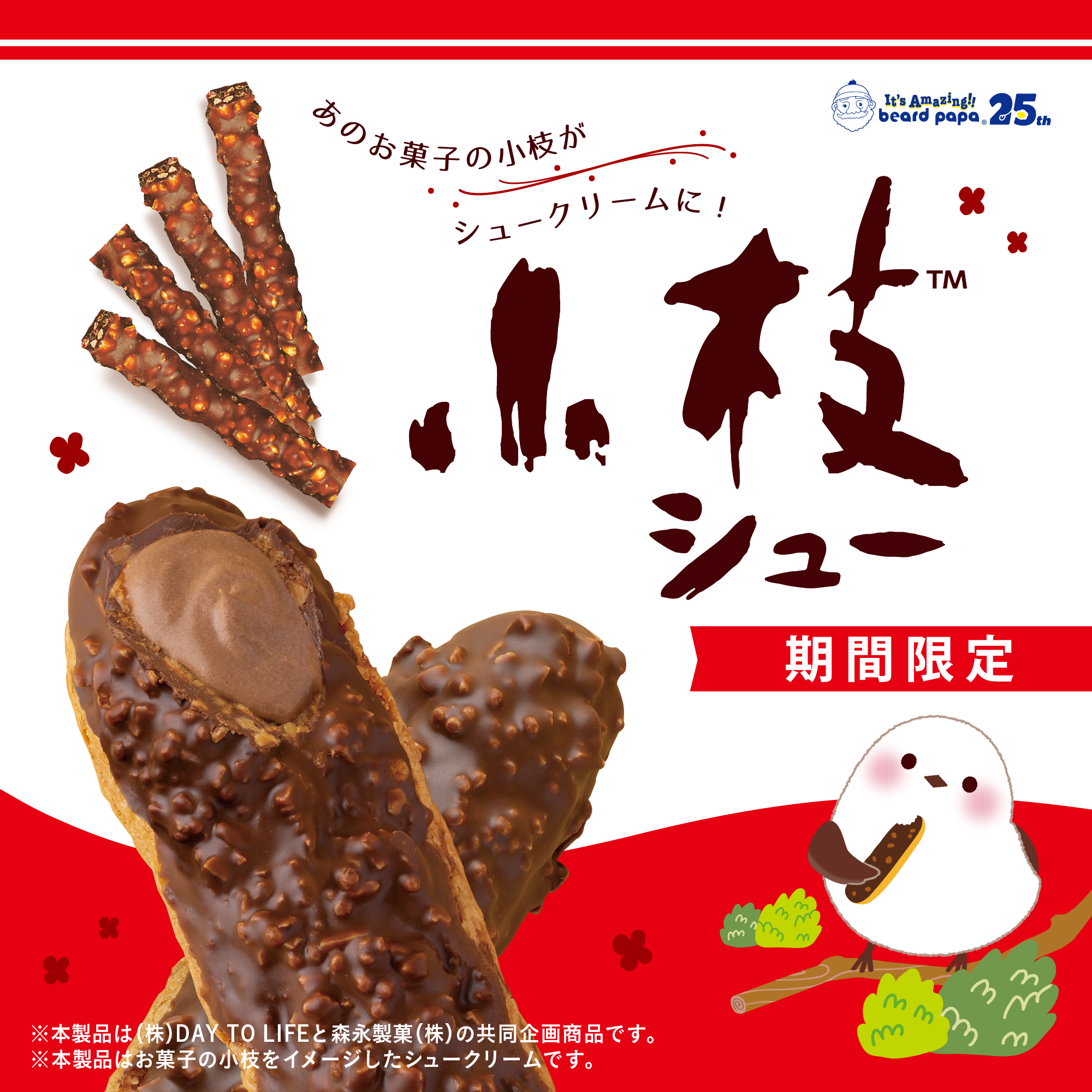 株式会社DAY TO LIFE(本社:大阪府大阪市北区、代表取締役:杉内健吉)は、今年で25周年を迎えたシュークリーム専門店ビアードパパにて森永製菓株式会社(本社:東京都港区、代表取締役社長:太田栄二郎)のロングセラー人気菓子“小枝<ミルク>”とのコラボレーション商品“小枝シュー”を2024年9月1日(日)より期間限定で販売いたします。“小枝シュー”は、スティック型のシュー生地に、アーモンド、パフ、コーティングチョコを付け、くちどけなめらかなチョコクリームを詰め込んだ、まるで小枝<ミルク>のような見た目の再現度が話題となった人気のコラボシュークリーム。食べ応え抜群ながらも小枝<ミルク>のおいしさをイメージした繊細な味わいは、まさに食欲の秋にぴったりです。