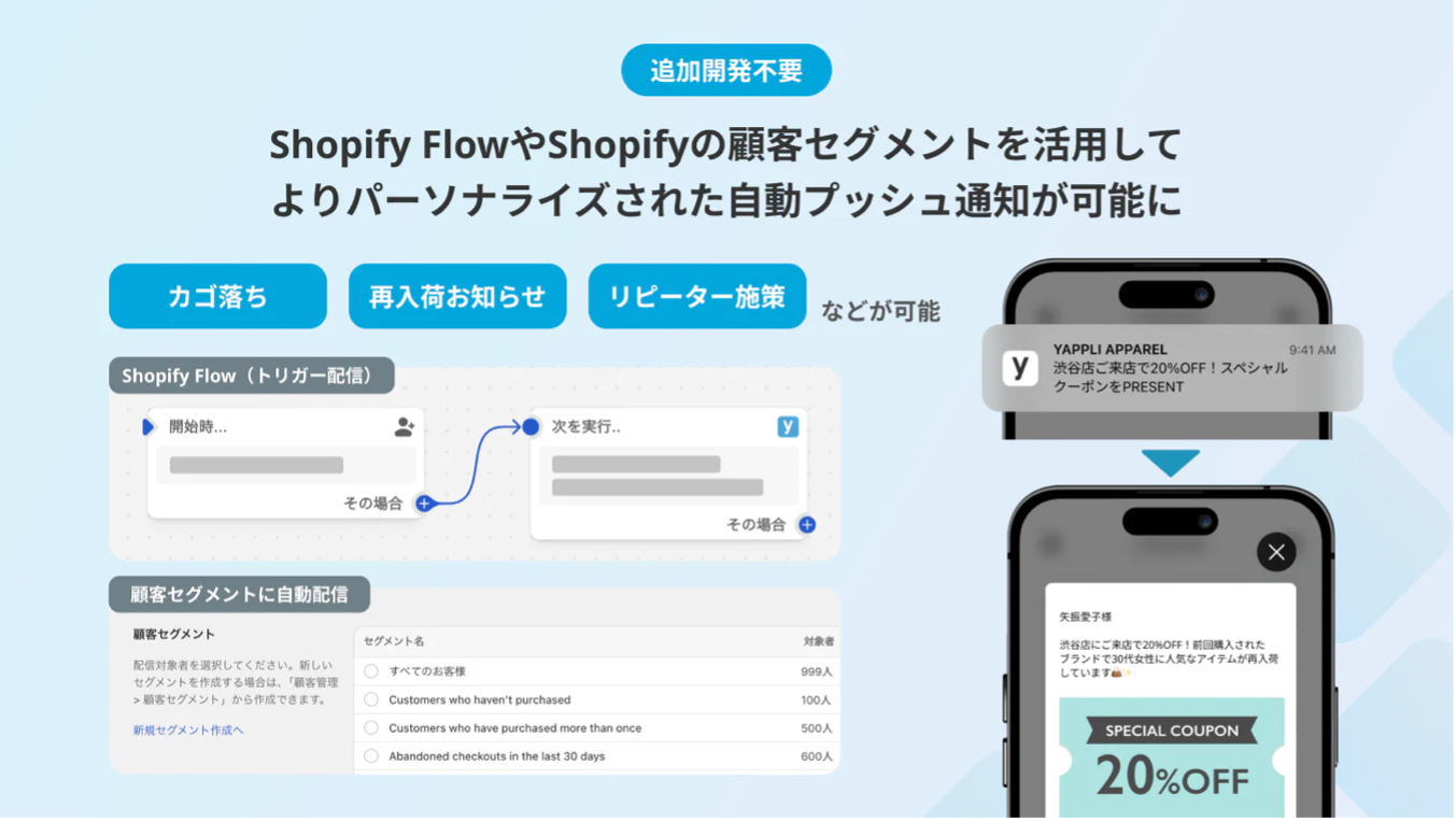 今回の連携により、Shopify Flow(※)を活用し、Shopifyストアでの顧客行動をトリガーに、Yappliで構築したアプリへプッシュ通知を送信する仕組みを、開発不要で実現可能となりました。