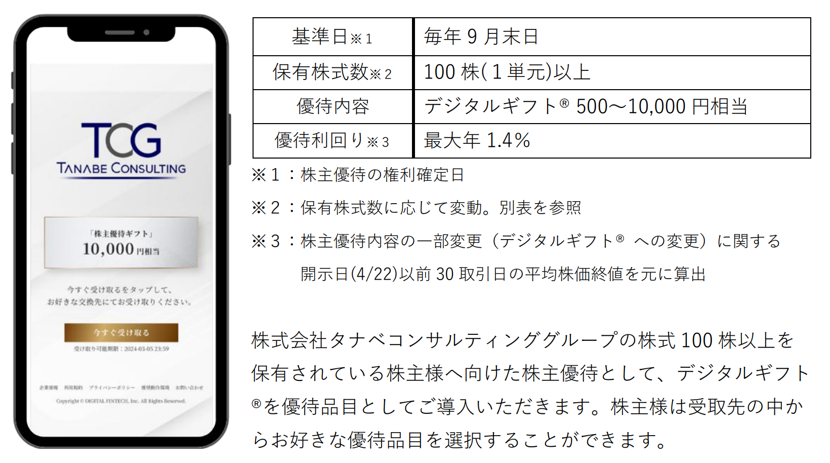 株式会社タナベコンサルティンググループ(代表取締役社長:若松 孝彦、東証プライム:証券コード 9644)において、株式会社デジタルプラス(代表取締役社長:菊池 誠晃、本社:東京都渋谷区、東証グロース市場:証券コード3691)グループが運営する「デジタルギフト®」を株主優待としてご活用いただくことになりました。