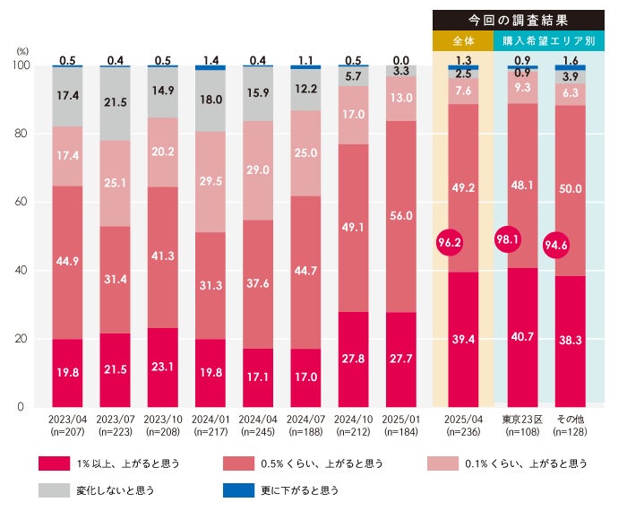 一方で、変動金利の今後の動向に関する見通しについても調査を実施したところ、「今後、変動金利は上昇すると思うか」という設問に対し、96.2%の方が「少なくとも0.1%以上は上がると思う」と回答しました。将来的な金利上昇リスクに対する警戒感が高まっている様子がうかがえます。