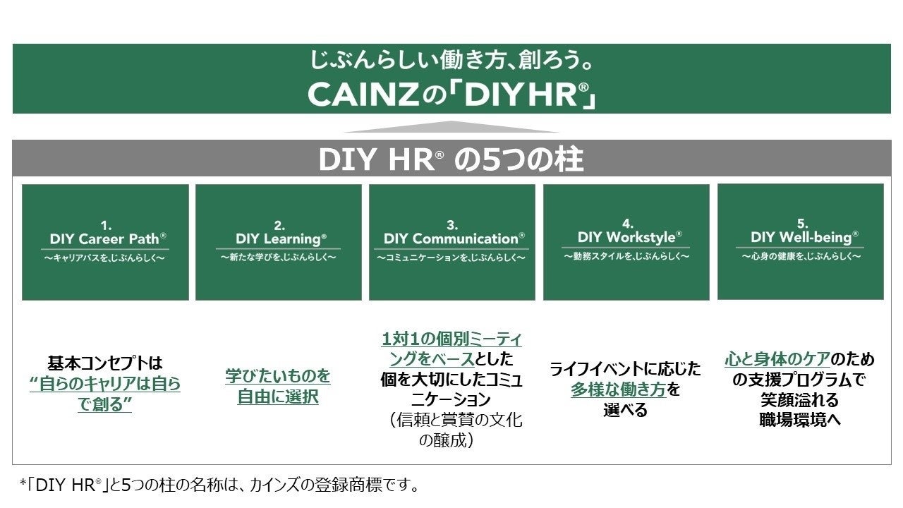 カインズでは、2021年9月に新たな人事戦略「DIY HR®」をリリースしました。カインズには、くらしを良くするために自分で創意工夫すること全てが「DIY(Do It Yourself)」であるというDIY思想があります。DIY HR®の基本コンセプトは、その思想を組織文化へも浸透させようというものです。DIY HR®は、DIY Career Path®、DIY Learning®、DIY Communication®、DIY Workstyle®、DIY Well-being®の5つの柱から成り立っています。その柱ごとに展開されている施策によって、正社員だけでなく、店舗で働くパート・アルバイトを含めた全てのメンバーの顕在的、潜在的な個の力を引き出し、組織パフォーマンスを最大化することを目指しています。