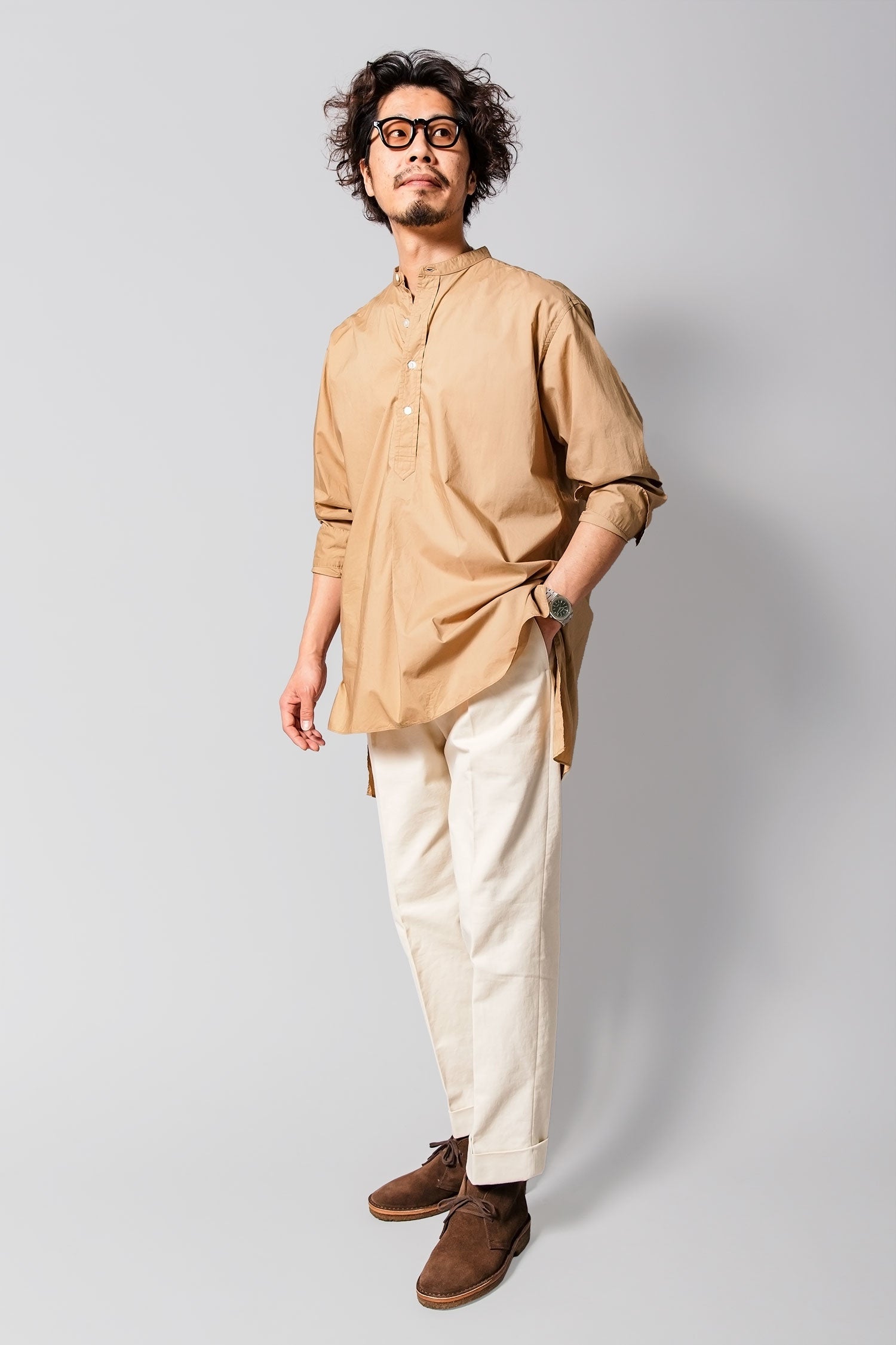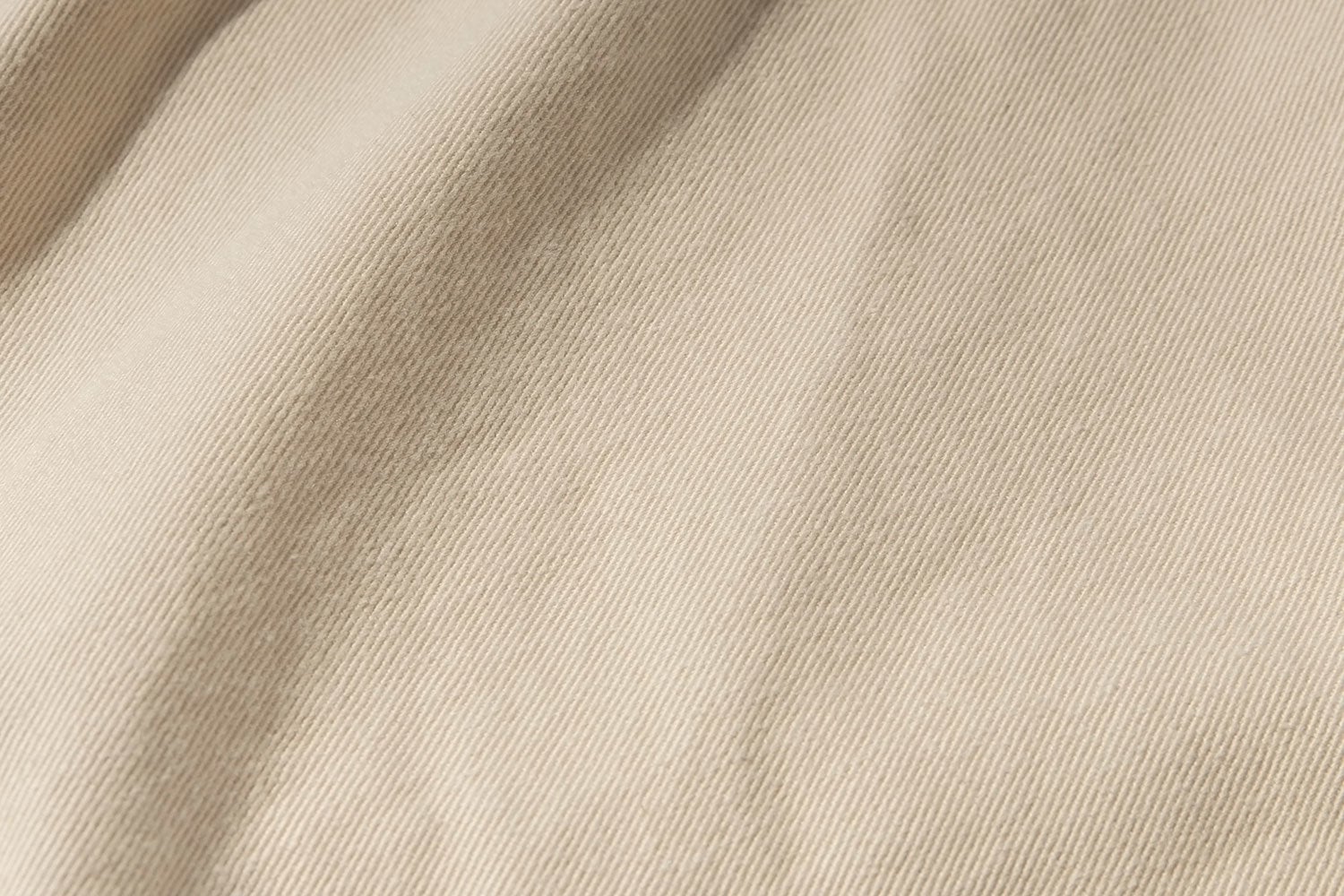 ヴィンテージテイストを表現するため、生地は程よい厚みとハリ感のあるコットンツイルを採用。ライトベージュとオフホワイトの中間をゆく独特の色みは、特殊な染色方法を行うことで実現したもの。さらに、生地の表面をなめらかにする仕上げ加工をあえて行わないことで、ドライで膨らみ感のある武骨な風合いも演出しています。