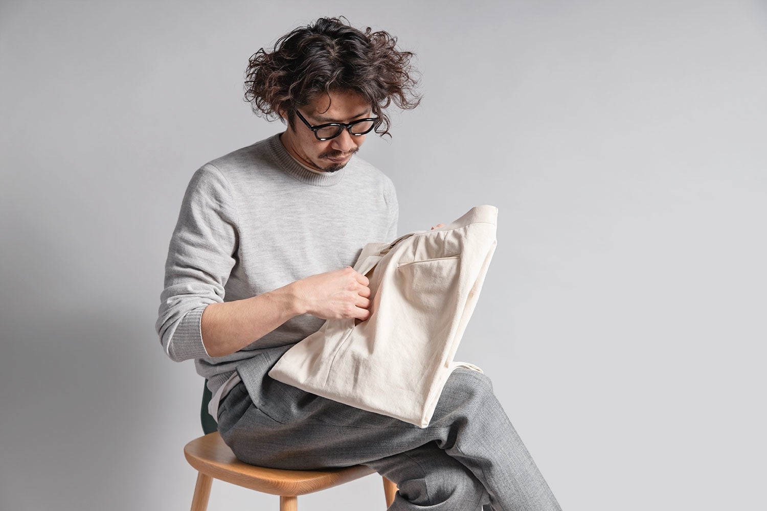 「普段の仕事では最高級のテーラードウェアにも触れているので、作りのよさは外せない条件でした。長野アルプスさんは50年間にわたって本格ドレスパンツを生産する名門ですので、全体のシルエットから細部の作り込みまで大満足の一本に仕上げていただきましたね。それから今回の生成りパンツに関しては、裾を最初からダブルに上げてもらったのもポイントです。裾上げの手間が要らず、買ってすぐ着用できるため便利ですよ」(四方さん)