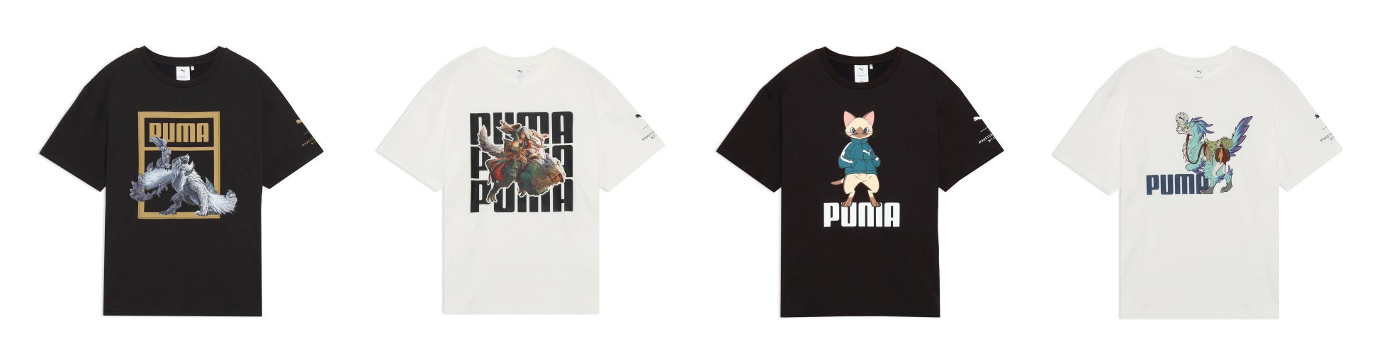 アパレルには、各エリアを象徴するモンスターをデザインしたフーディーや、モンスターの肌感を表現し、胸元に調査隊エンブレムをあしらったAOPトラックジャケットが登場。さらに、プーマを象徴するトラックジャケット“T7”を着用した今回限定描き下ろしのアイルーをデザインしたTシャツや、プーマキャットの上に乗ったアイルーをあしらったフーディーなど、特別仕様のアイテムもラインアップします。