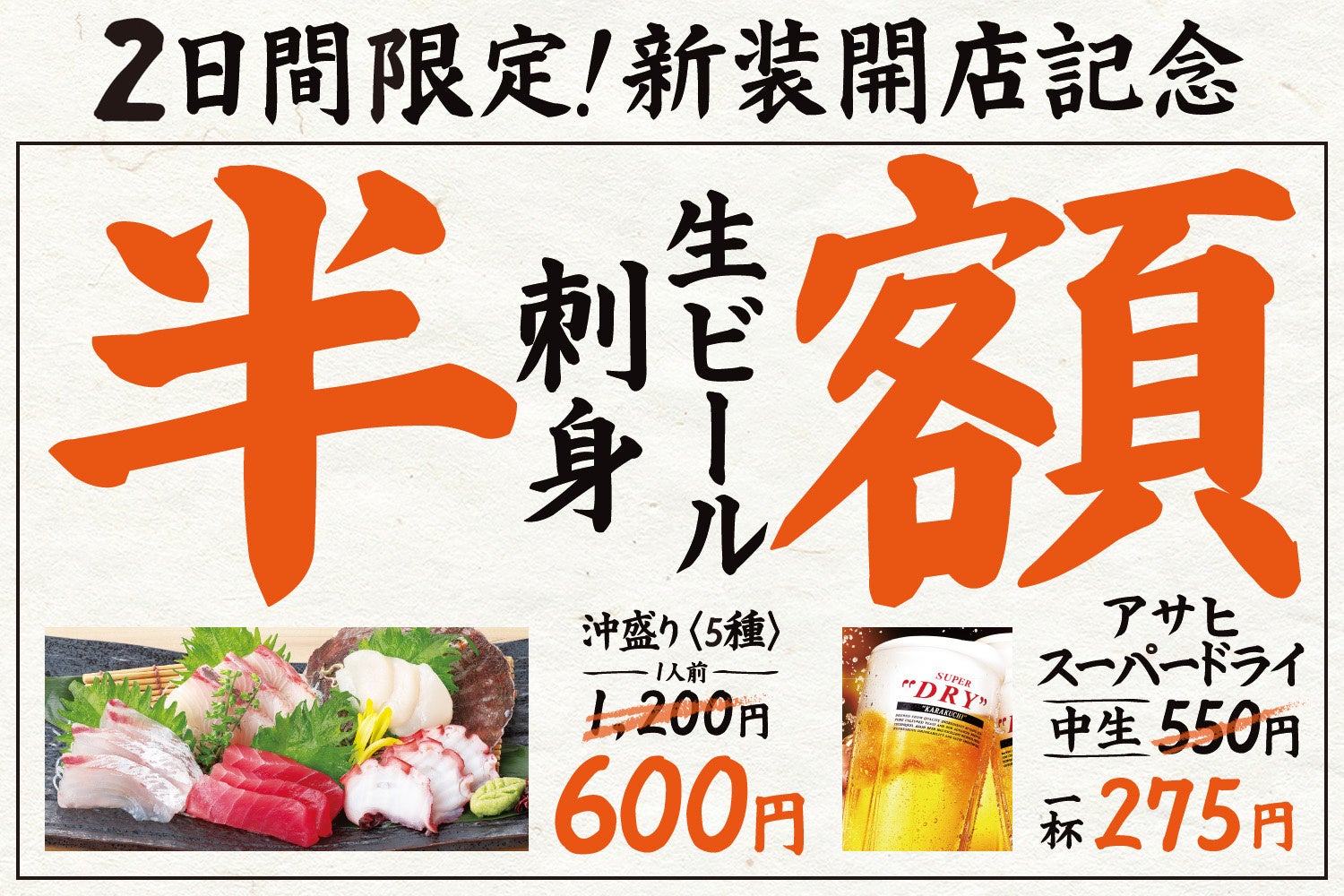 株式会社大庄(東京都大田区/代表取締役社長:平 了壽)は、2025年11月19日(水)、板前がいる町の酒場『庄や』南浦和店を全面改装し、リニューアルオープンします。オープンを記念して、2025年11月19日(水)・20日(木)の2日間限定で、名物の刺身盛り合わせ「沖盛り〈五種〉」(通常1人前1200円)を半額の600円で、「アサヒスーパードライ 中生」(通常1杯550円)を半額の275円で提供するイベントを実施します。加えて、期間中は地域の皆様へ感謝を込めたハイボールを1杯39円、日替わりで銘柄日本酒3種を各一合500円で提供します。
