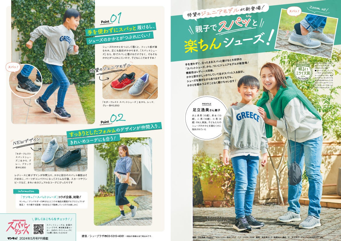 手を使わずに立ったまま、スパッと履ける!セダークレスト「スパットシューズ」にジュニアモデルが新登場!生活情報誌No.1(※1)「サンキュ!」にもPR掲載中。