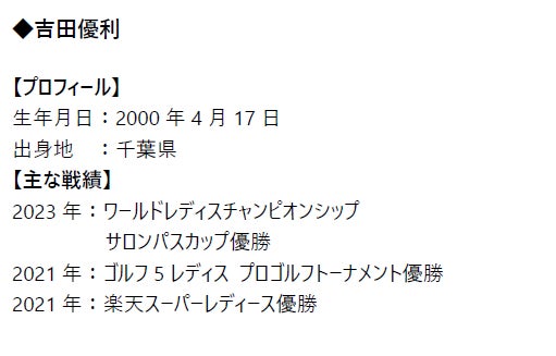 3月21日~23日に紫カントリークラブ すみれコース(千葉県)で行われた国内女子ツアー「Vポイント×SMBCレディスゴルフトーナメント」において、単独首位からスタートしたボール・クラブ・用品契約の吉田優利が、最終日4バーディ、1ボギー、1ダブルボギーの71でプレーし通算13アンダーとして、2位に9打差の大差をつけ、地元千葉県で国内女子ツアー4勝目を遂げました。国内女子ツアーでの優勝は、2023年の「ワールドレディスチャンピオンシップ サロンパスカップ」以来、2年ぶりとなります。なお、7位Tには、ボール・用品契約の大里桃子が入りました。