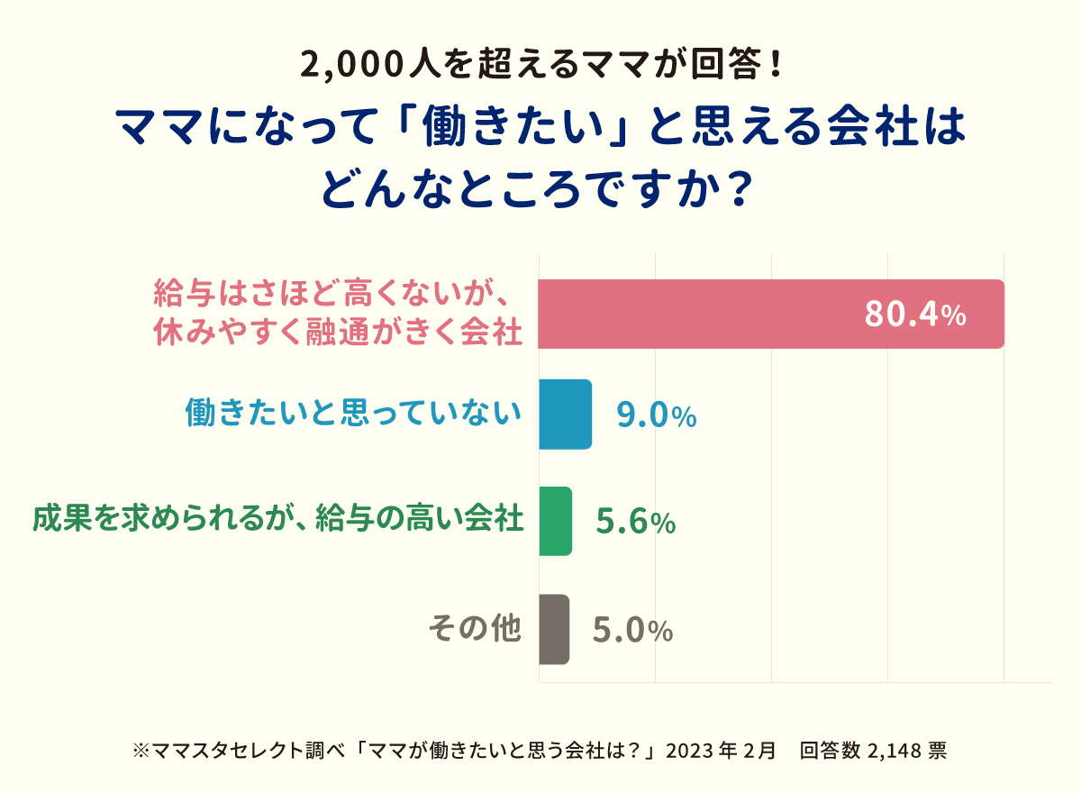そして、今回のアンケートでもっとも多かった回答は「給与はさほど高くないが、休みやすく融通がきく会社」を選んだママたち。じつに8割を超えるママたちが、給与よりも働きやすさを重視したいと考えています。