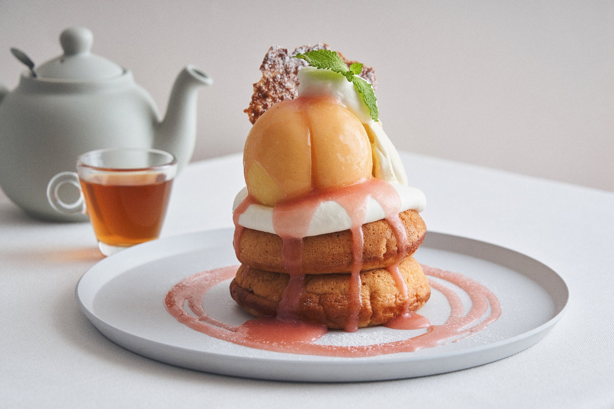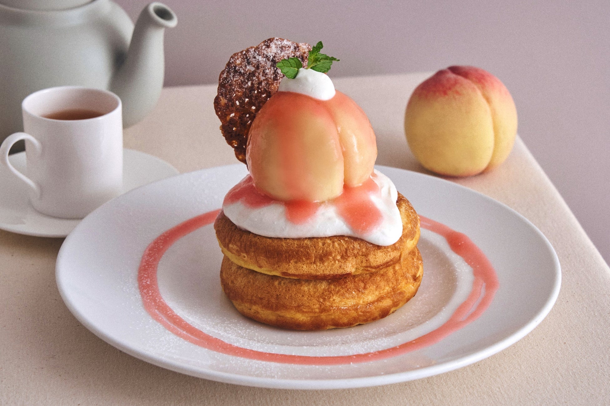 甘くてジューシー、まるで天使の肌のようなやわらかさの“岡山白桃”を贅沢にまるごと1個使用!みずみずしい桃の中には生クリームで軽やかに仕上げたカスタードクリームをぎゅっと。隠し味に練乳を加えコクがアップした、くちどけの良いミルキークリームと合わせました。今が旬の特別なパンケーキです。