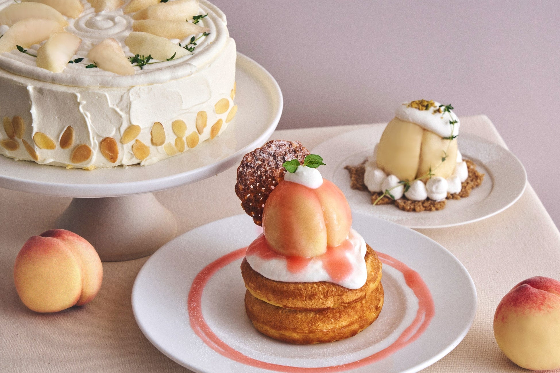 桃×アールグレイのフルーティーな掛け合わせのムースケーキや王道のショートケーキに桃のパフェ...「岡山白桃」の上品な甘さを引き立てるデザートも!