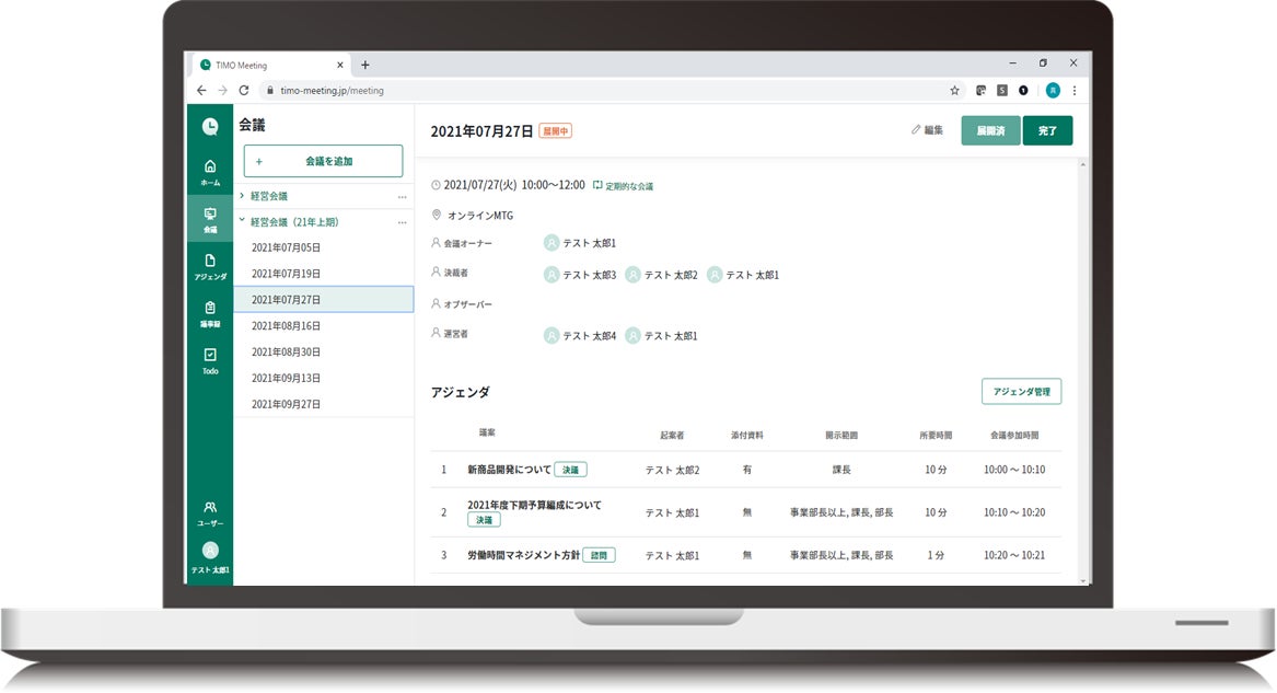 「TIMO Meeting」は、会議前~会議後までのプロセスをデジタル化と一元管理を通じて「会議品質の向上、会議時間の削減」を実現するミーティングマネジメントツールです。