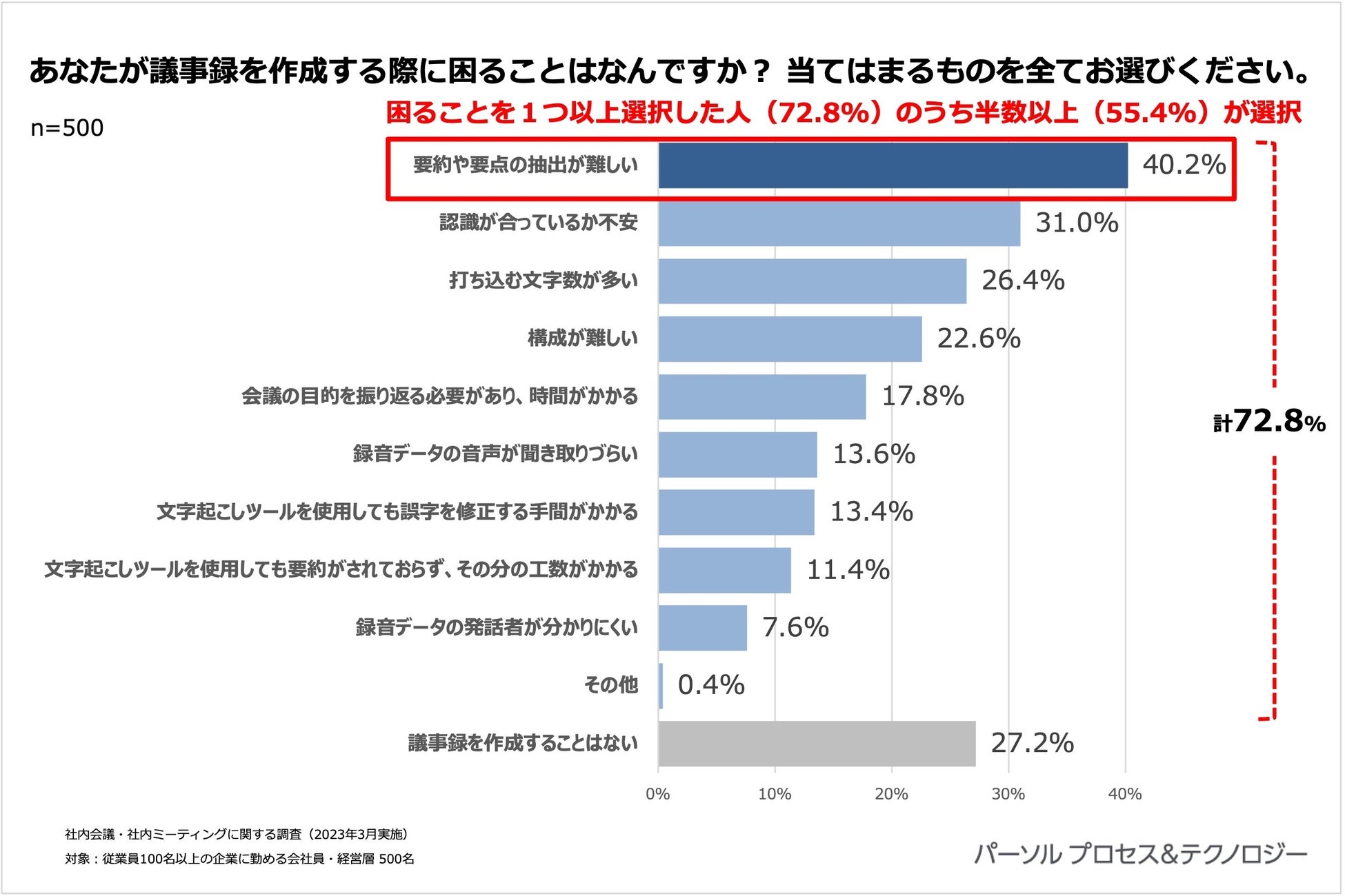2023年3月に実施した、従業員100名以上の企業に勤める会社員・経営層500人を対象とした当社の調査では、実際に議事録を作成する人が困ったこととして「要約や要点の抽出が難しい」を選択した人が半数以上と最も多く、また良い議事録について聞いた質問でも「要約や要点がまとまり、すぐ理解できる」ことが76.8%で最も多く選択されるなど、議事録の要約や要点抽出の簡易化・効率化ニーズはとても高いことがわかります。