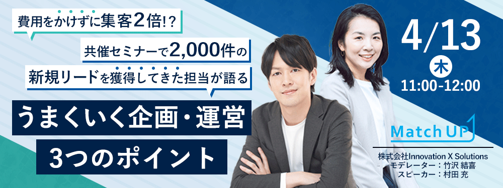 【4/13(木)Webセミナー】「費用をかけずに集客2倍!?共催セミナーで2,000件の新規リードを獲得してきた担当が語る"うまくいく企画・運営"3つのポイント」をテーマにセミナーを開催