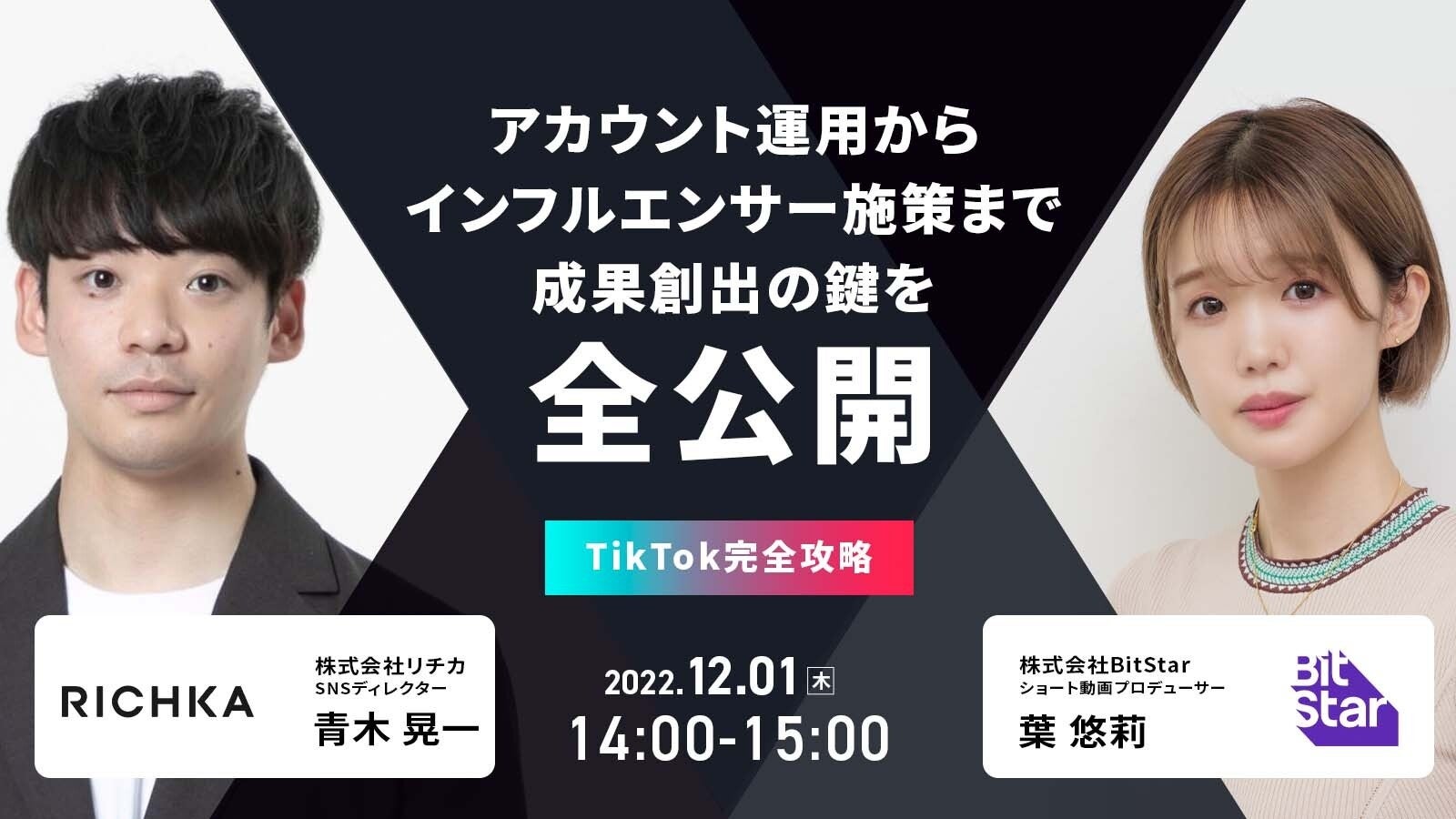 株式会社BitStar(本社:東京都渋谷区、代表取締役 社長執行役員CEO:渡邉拓、以下BitStar)と株式会社リチカ(本社:東京都渋谷区、代表取締役:松尾幸治、以下リチカ)は、12月1日(木)14:00より企業さまへ向けた無料ウェビナー「TikTok完全攻略 アカウント運用からインフルエンサー施策まで、成果創出の鍵を全公開」を共催いたします。