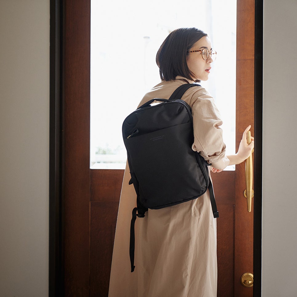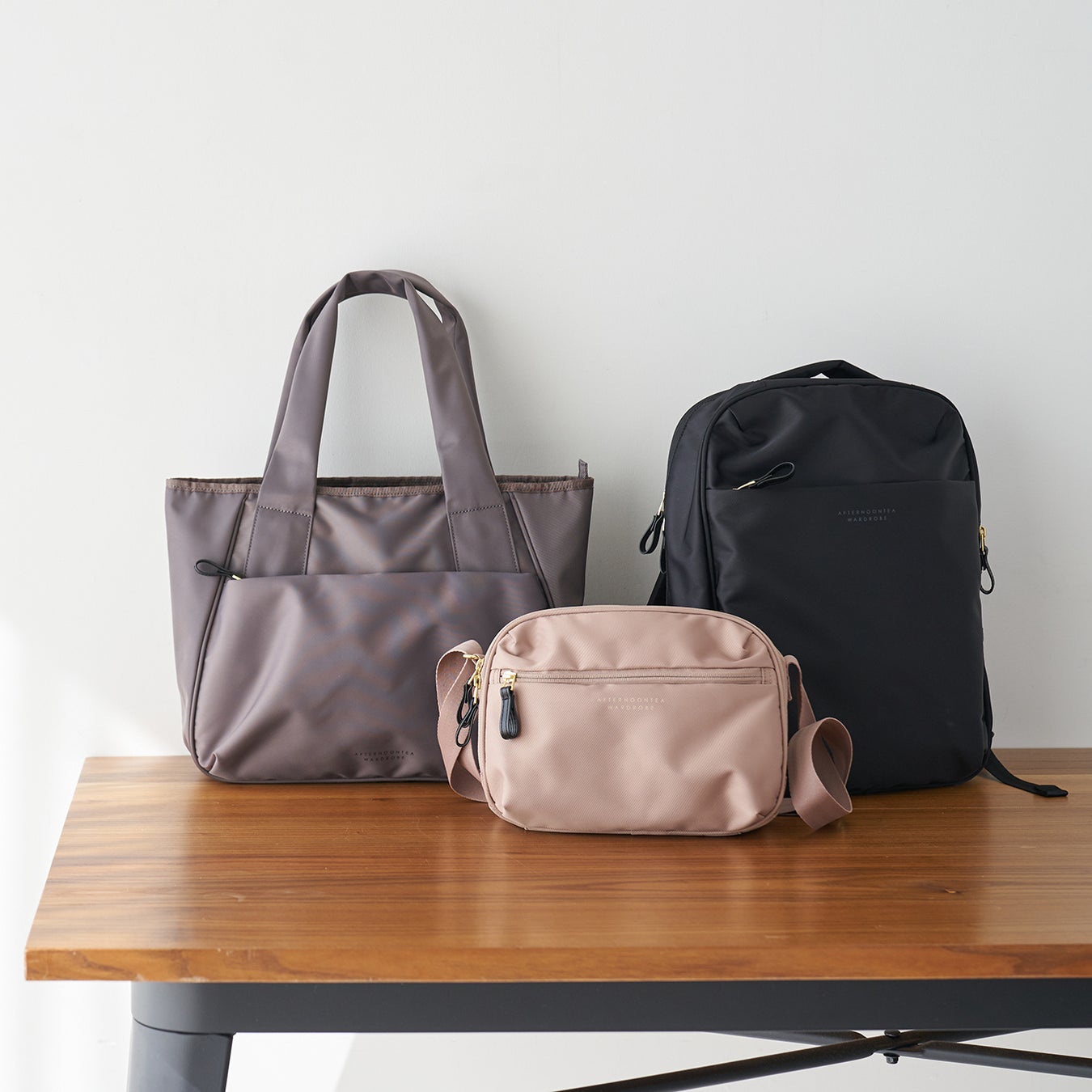 お仕事バッグの定番トートバッグ、重い荷物を少ない負担で持ち運べるリュックサック、そして第2弾ではオンオフ兼用できるショルダーバッグを新たに追加しました。荷物が少ない日に便利なショルダーバッグは、小ぶりながらも必需品がしっかり入るサイズです。