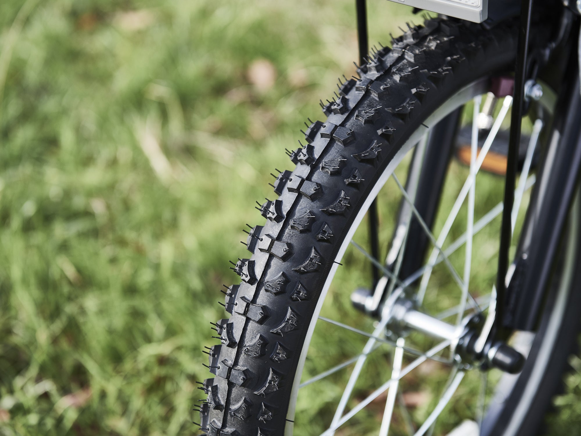 クッション性が高く、アウトドアでも街中でも走行しやすい幅広ブロックタイヤを採用。