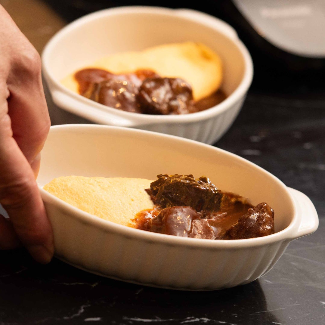 時間をかけて煮込んだ沖縄県産和牛のビーフシチューをご用意。濃厚な味わいの琉球卵を使用したオムレツとともにお楽しみください。
