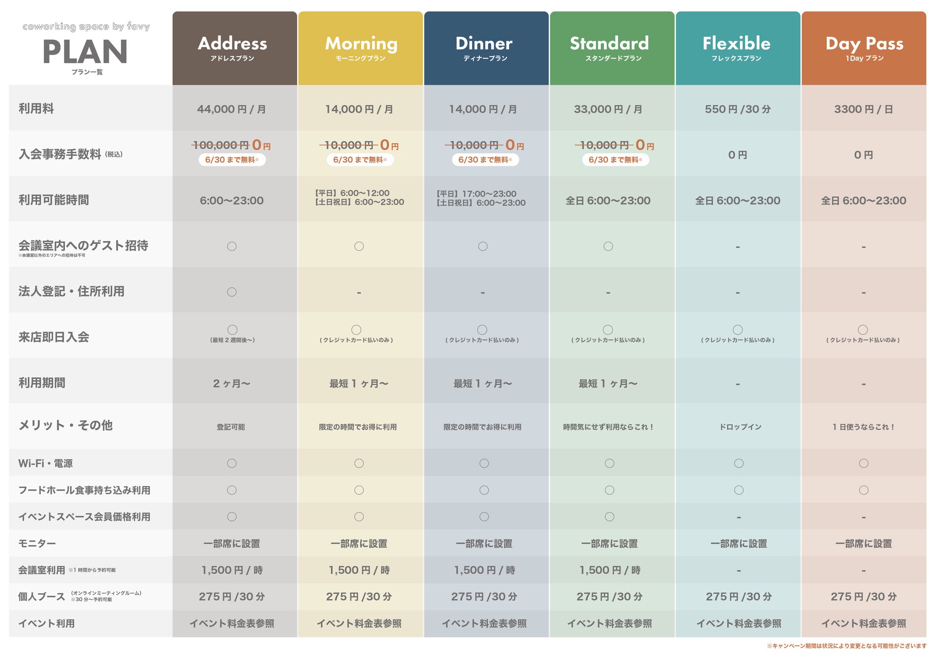 『コワーキングスペース by favy』の料金プランは、法人登記・住所利用ができる「アドレスプラン」のほか、平日6:00〜12:00と土日祝が終日利用可能な「モーニングプラン」、平日17:00〜23:00と土日祝が終日利用可能な「ディナープラン」、30分単位で利用可能な「フレックスプラン」など6種類を用意。ご利用される方のライフスタイル合わせて自由にお選びいただけます。