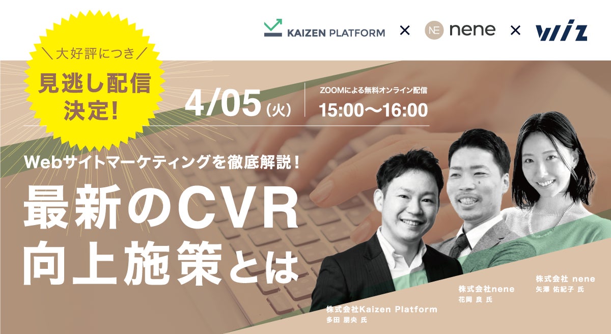 そこで本セミナーでは、株式会社Kaizen Platformの「5万回超のサイト改善施策から導き出した最新のCVR向上の手法」と、株式会社neneの「ROI700%越えの費用対効果を生み出した、売上向上に寄与するトレンドのWeb施策」を成功事例を交えてご紹介。