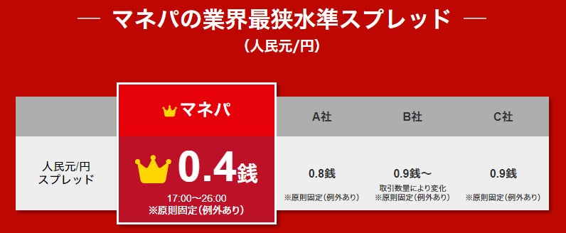 - 業界最狭水準の人民元/円スプレッドが、さらに縮小して0.4銭に!