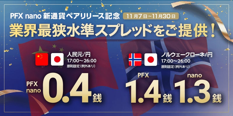 株式会社 マネーパートナーズ(代表取締役社長:福島秀治、本社:東京都港区、以下「マネーパートナーズ」)は、パートナーズFXおよびパートナーズFXnanoにおいて、2022年11月7日より「人民元/円」「ノルウェークローネ/円」のキャンペーンスプレッドをさらに縮小して提供いたします。※原則固定(例外あり)