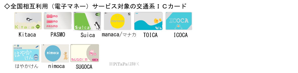 ※Kitaca、PASMO、Suica、manaca/マナカ、TOICA、ICOCA、はやかけん、nimoca、