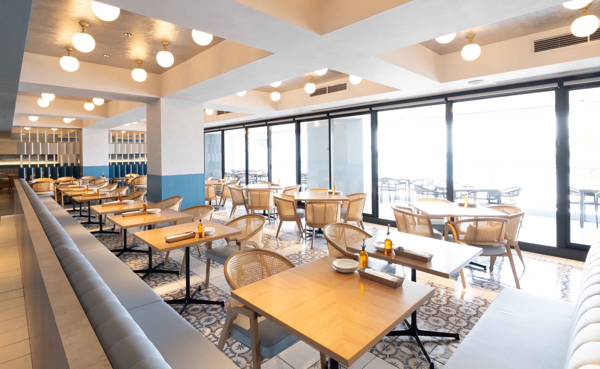 目の前に広がるのは、岬に囲まれた逗子海岸と澄んだ青い海。店内には、海風を感じるテラス席36席、個室3部屋(6名×2、14名×1/計26席)を含む全188席をご用意。特にテラス席からは、ロマンティックな夜景も楽しめます。逗子海岸の風景や波をモチーフにした装飾と、海中を思わせる照明が、どの席からも“海”を感じる心地よい空間を演出。