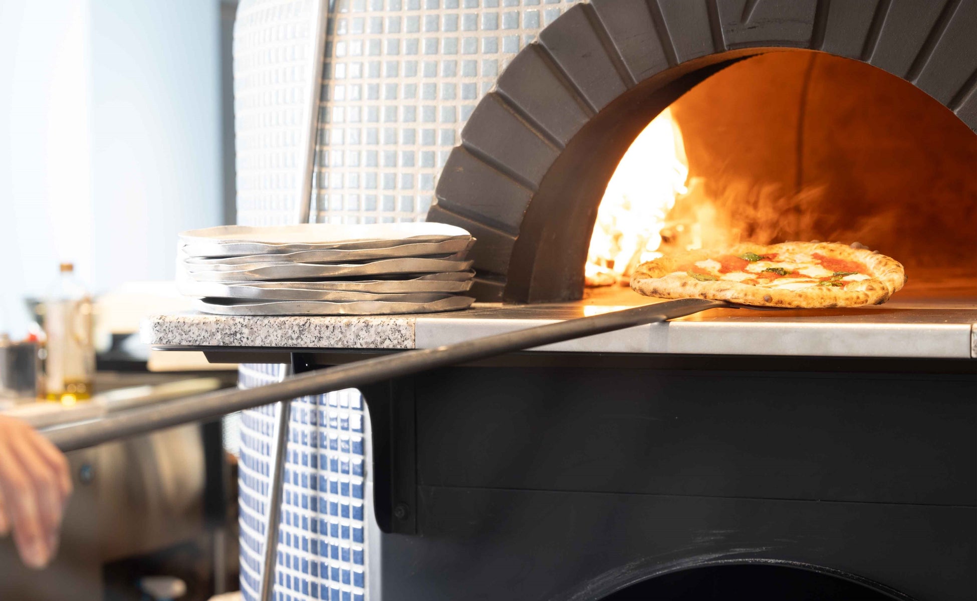 ピッツァイオーロ(ピザ職人)が生地を伸ばし、具材をのせ、450℃のイタリア直輸入薪窯で一気に焼き上げるパフォーマンスとともに、外はカリッと、中はもっちり、香ばしい風味が広がる本場のナポリピッツァをお楽しみいただけます。