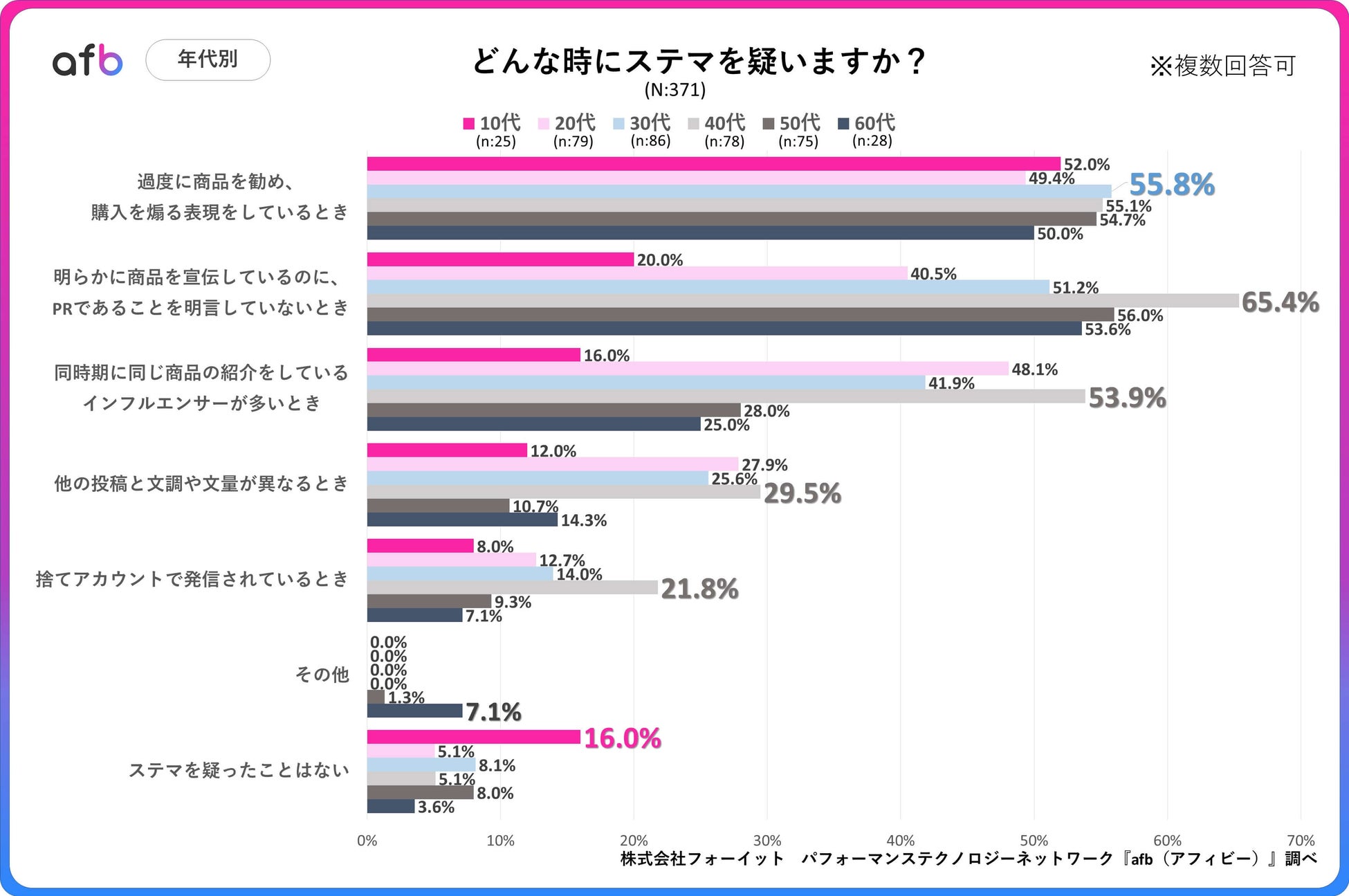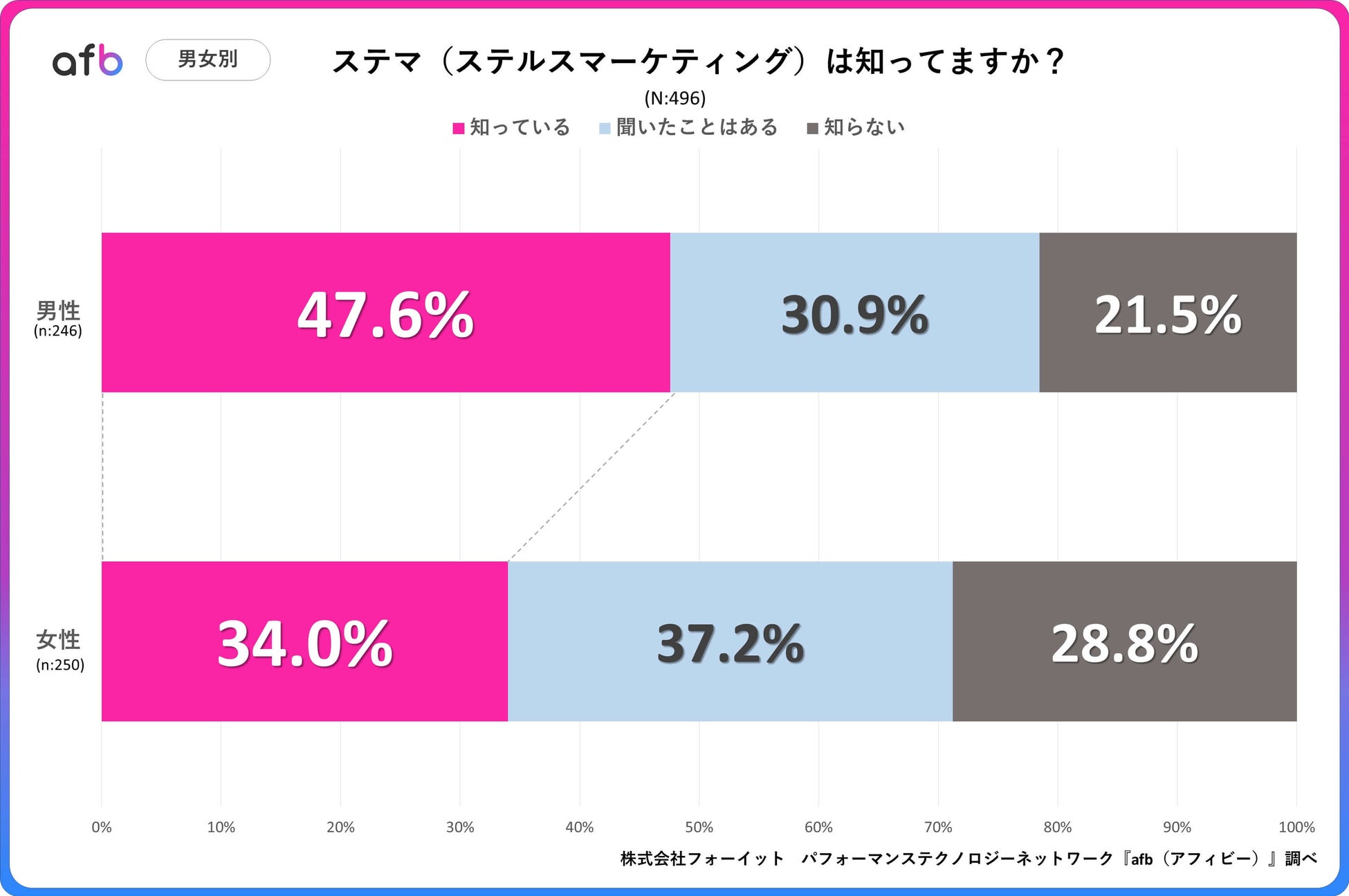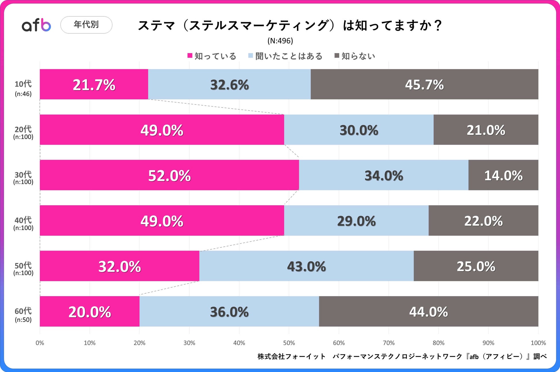 パフォーマンステクノロジーネットワーク「afb(アフィビー)」< https://www.afi-b.com/ >の開発運用をおこなう株式会社フォーイットは、全国の10代~60代までの男女500人を対象にステルスマーケティングに関するアンケートを実施し、年代別・男女別等の特徴についてまとめました。