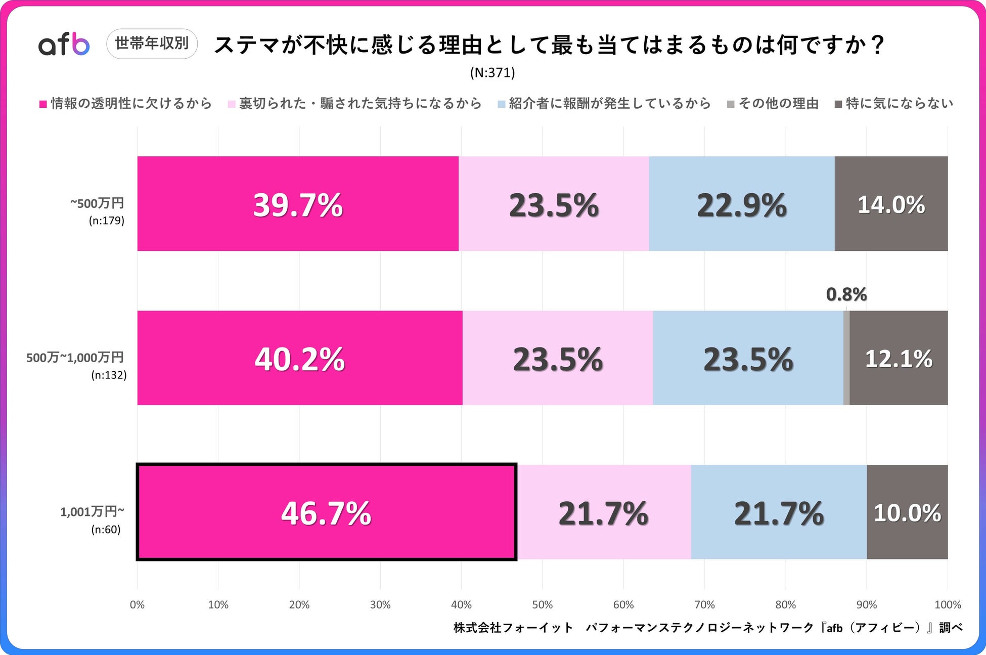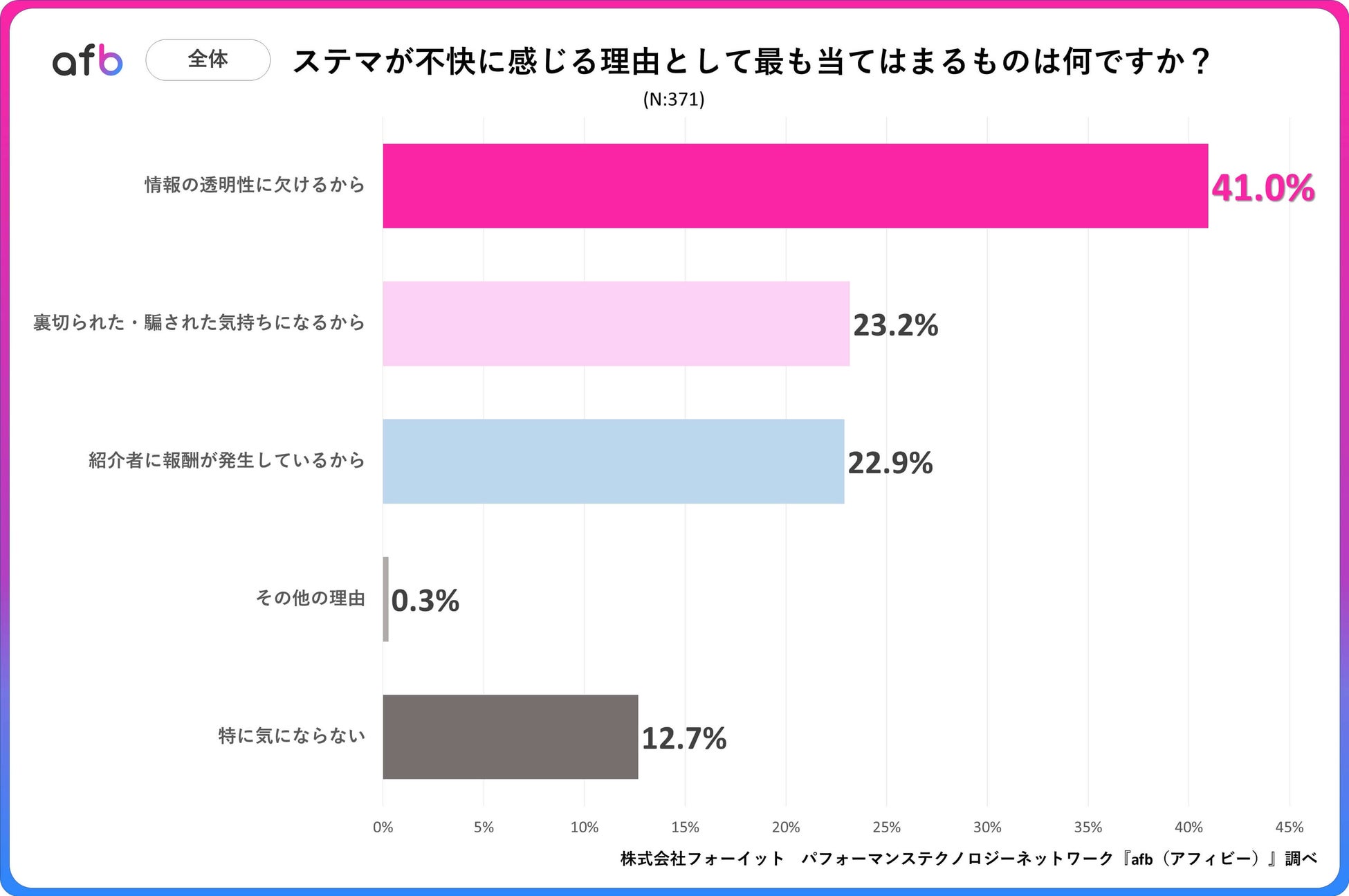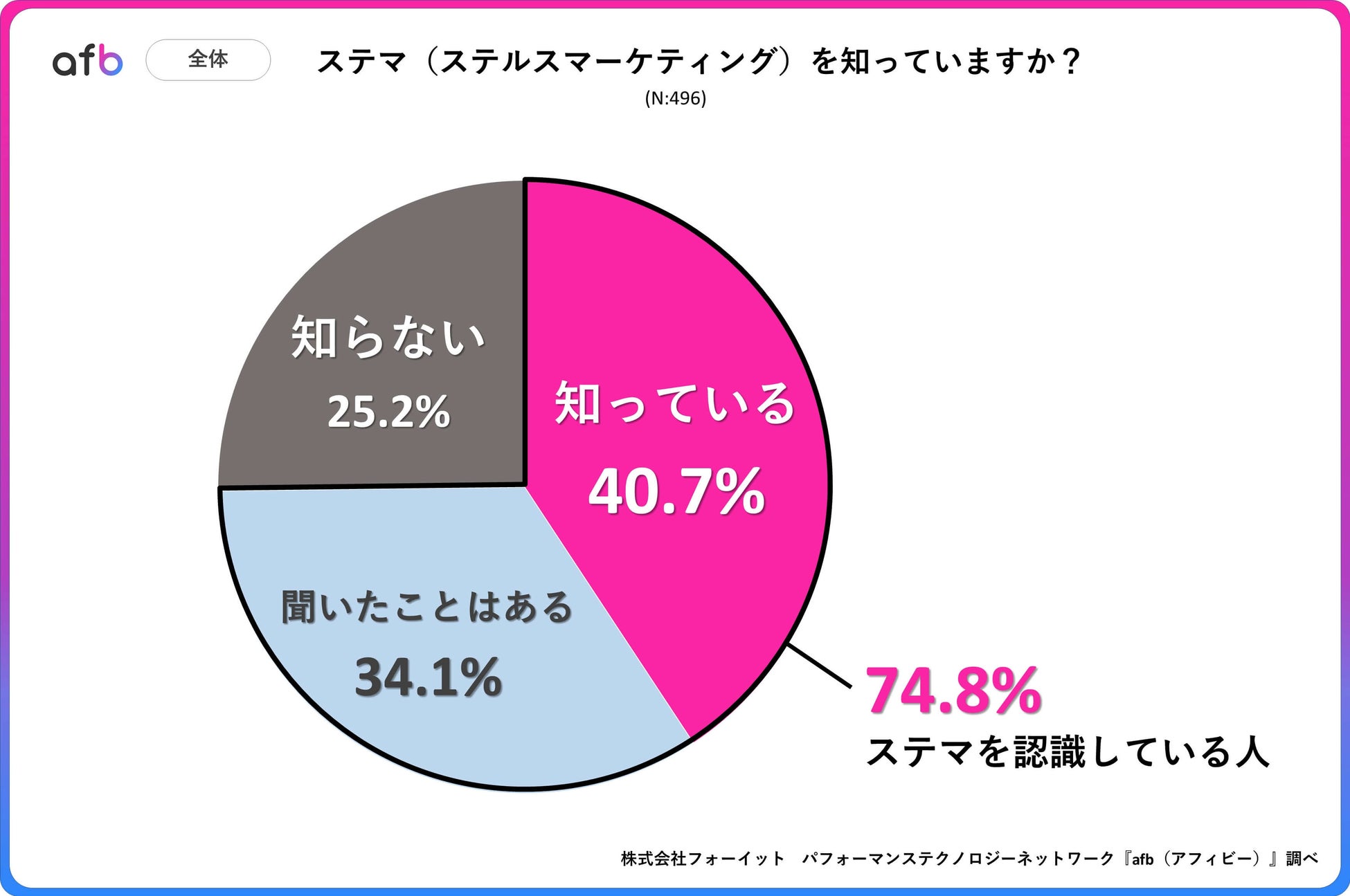パフォーマンステクノロジーネットワーク「afb(アフィビー)」< https://www.afi-b.com/ >の開発運用をおこなう株式会社フォーイットは、全国の10代~60代までの男女500人を対象にステルスマーケティングに関するアンケートを実施し、年代別・男女別等の特徴についてまとめました。